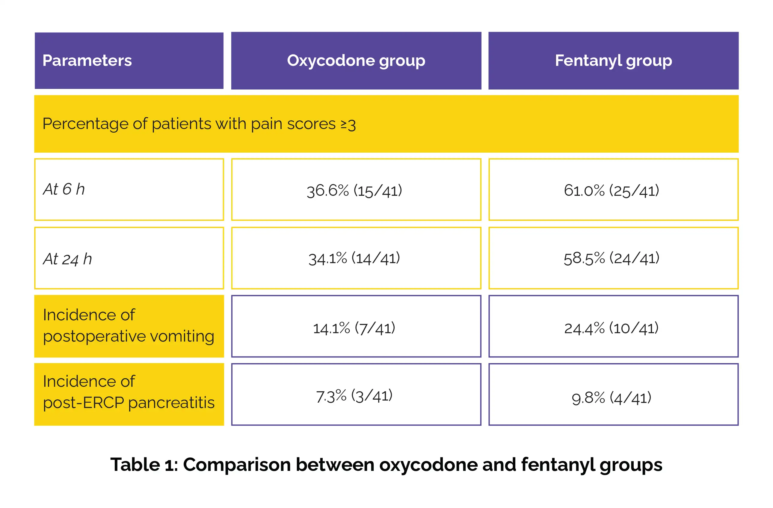 Participants receiving oxycodone experienced lower pain scores at 30 minutes, 6 hours, and 24 hours after ERCP compared to those receiving fentanyl. At 10 and 20 minutes, pain scores were comparable between the groups. Additionally, fewer children in the oxycodone group exhibited pain scores of 3 or higher at 6 and 24 hours after the procedure. The occurrence of postoperative vomiting was lower among those treated with oxycodone. On the other hand, the incidence of post-ERCP pancreatitis was similar across the groups, as shown in Table 1: