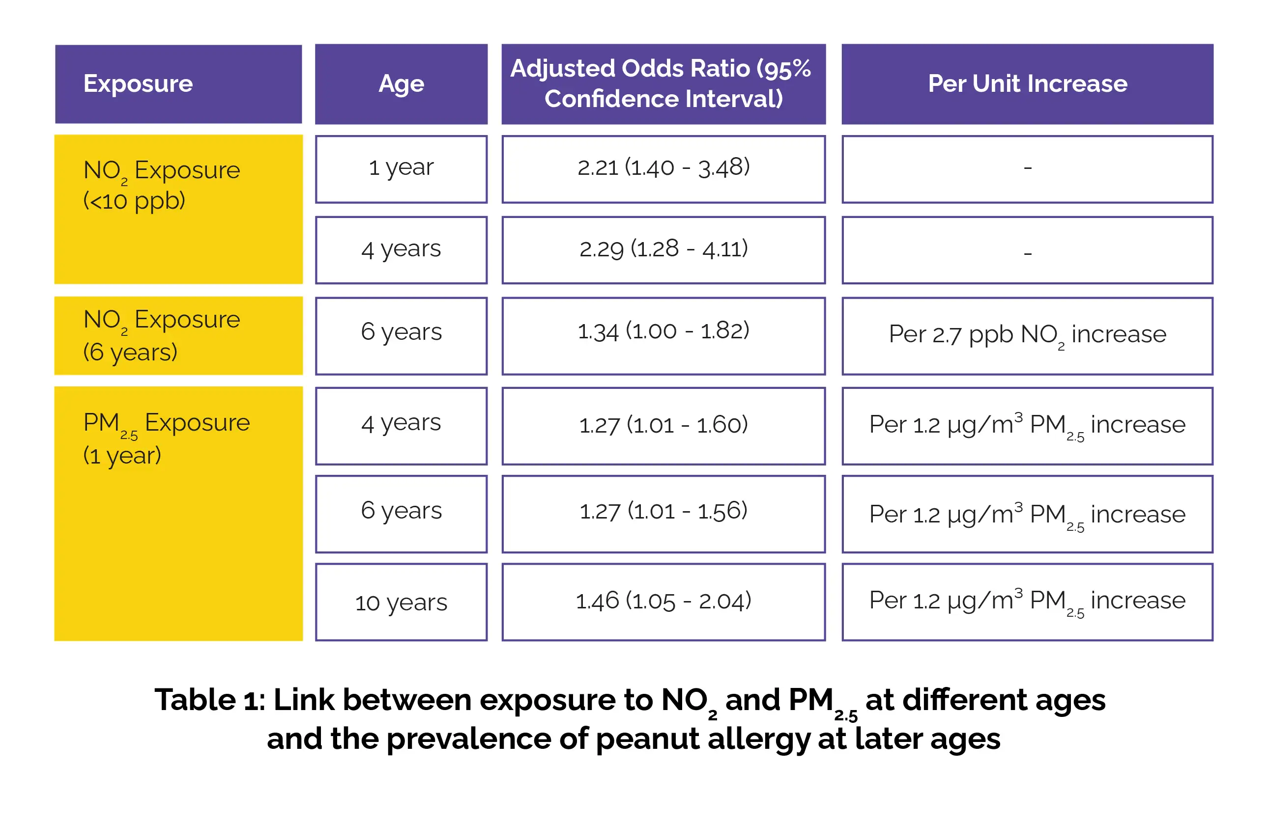 Encounter to raised NO2 levels (less than 10 parts per billion [ppb]) at 1 year was associated with increased incidence of peanut allergy at age 1 and age 4. Increased NO2 exposure at age 6 led to a higher prevalence of peanut allergy at age 6. Similarly, higher PM2.5 exposure at age 1 was linked to peanut allergy at younger years of life (aged 4, 6 and 10 years) (Table 1).