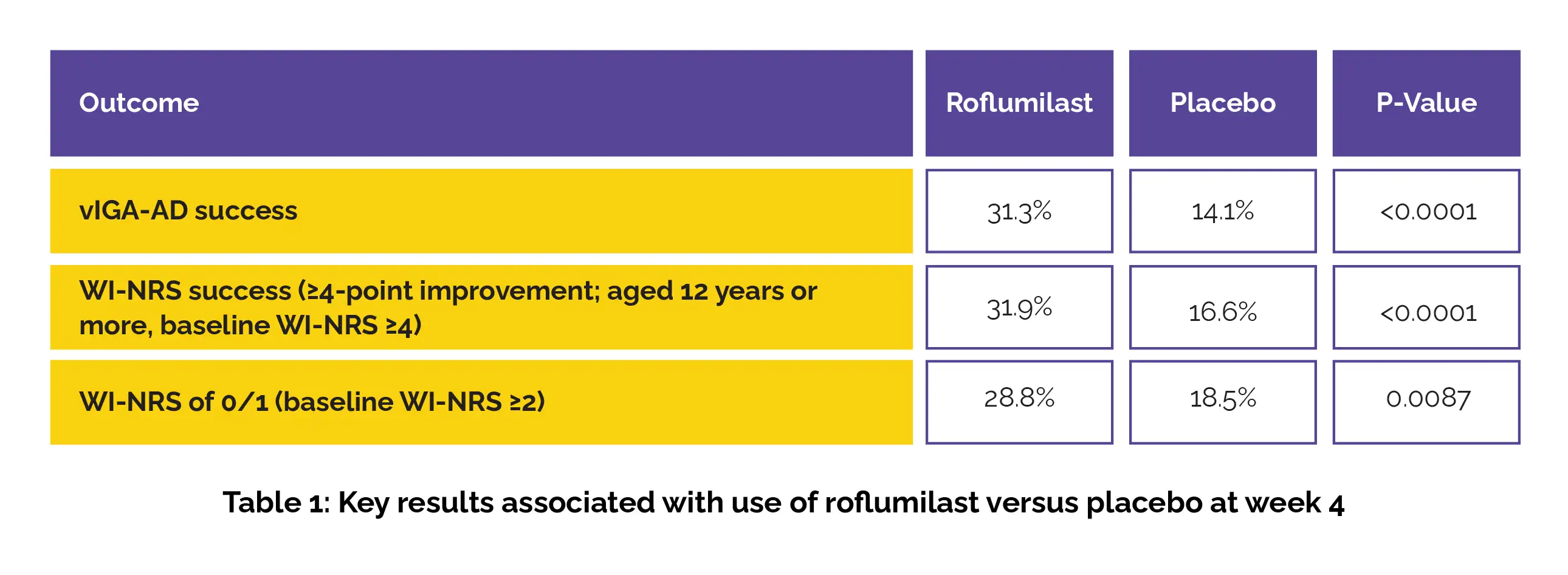 Compared to those on the placebo cream, a higher percentage of patients treated with Roflumilast achieved vIGA-AD success, WI-NRS success, and WI-NRS of 0/1 at week 4 (shown in Table 1):