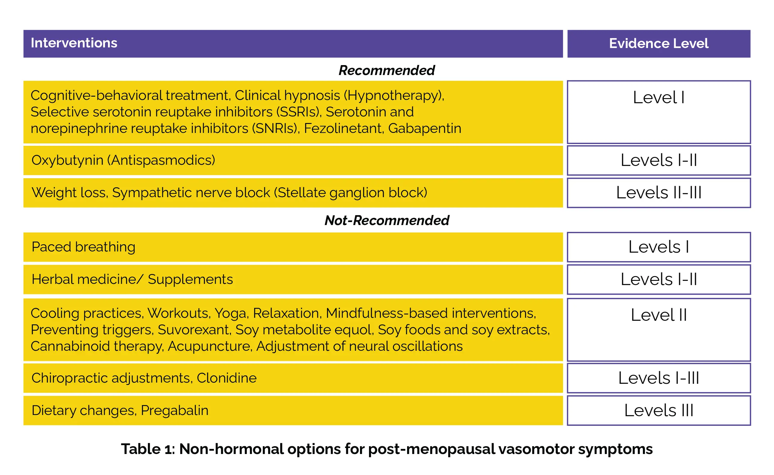 A thorough examination of the literature based on evidence identified multiple non-hormonal options for addressing vasomotor symptoms, as depicted in Table 1: