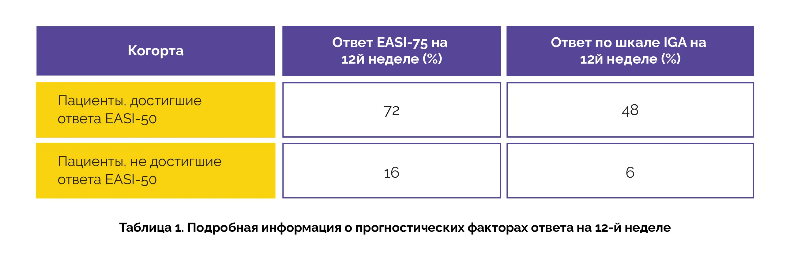 Результаты когорты обучения (n = 453) на основе доли пациентов, достигших и не достигших ответа EASI-50 на 4-й неделе приема аброцитиниба в дозе 100 мг, с указанием доли ответов EASI-75 и IGA на 12-й неделе представлены в таблице 1 ниже.