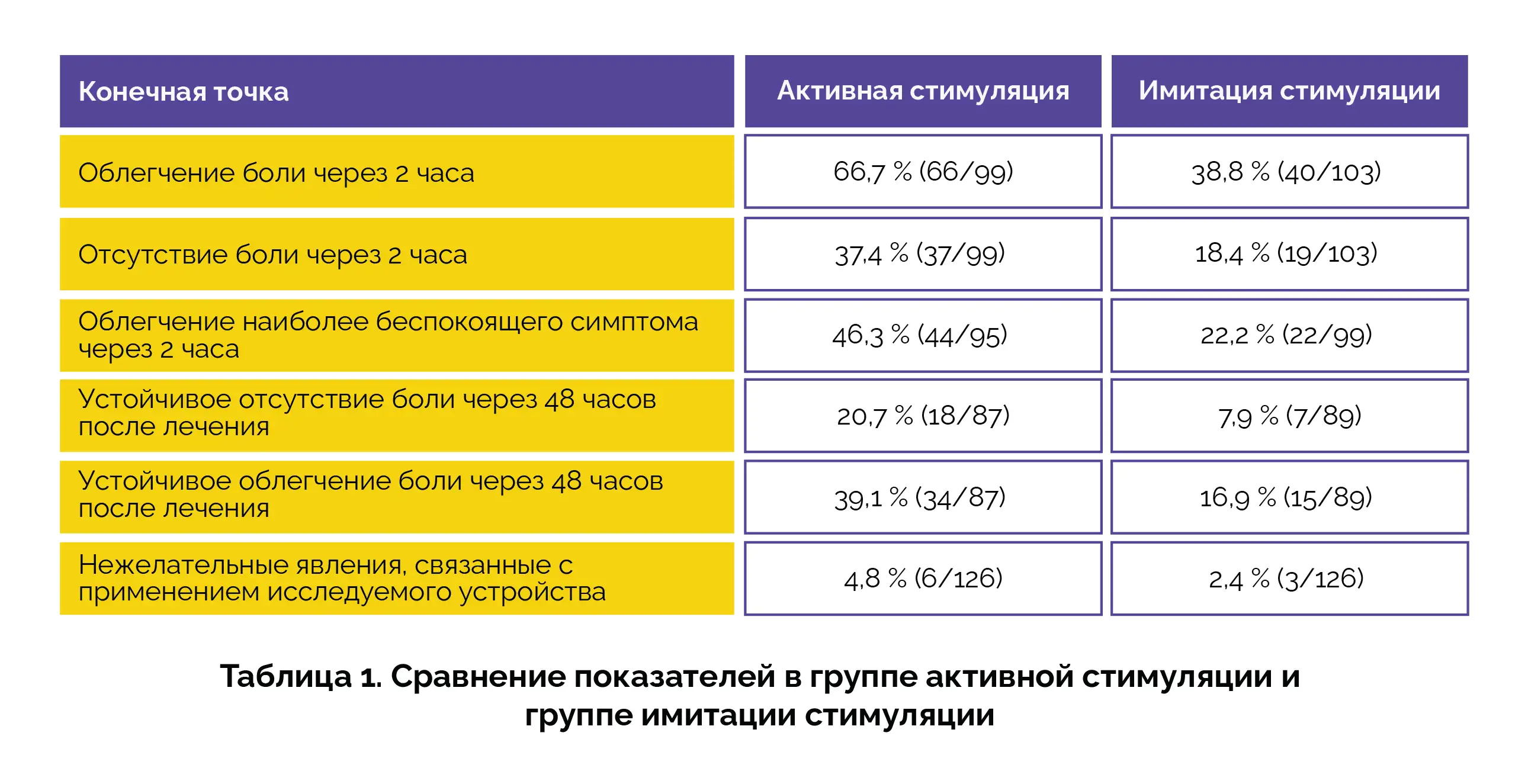 Основной конечной точкой была доля участников, через 2 часа после лечения достигших облегчения боли, определяемого как снижение интенсивности боли от умеренной или сильной до легкой или ее отсутствия. Ключевыми дополнительными конечными точками были облегчение наиболее беспокоящего симптома и достижение отсутствия боли через 2 часа. По сравнению с имитацией стимуляции активная стимуляция была более эффективной в достижении облегчения боли, отсутствия боли и облегчения наиболее беспокоящего симптома через 2 часа после лечения.