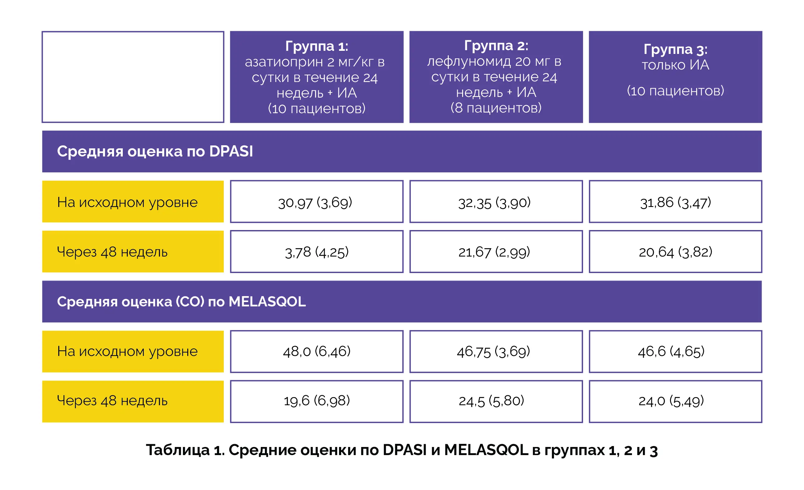 В исследование включили 28 пациентов с ПКД и положительным результатом аппликационной кожной пробы. В ходе исследования сравнивали эффективность применения азатиоприна с избеганием контакта с аллергенами (ИА) и применением лефлуномида. Наиболее распространенными аллергенами были красители для волос и парафенилендиамин. В таблице 1 и таблице 2 приведены данные о снижении средней оценки (СО) по индексу площади и степени тяжести дермальной пигментации (DPASI) и оценки по шкале качества жизни при мелазме (MELASQOL) в трех группах исследования (р < 0,001).