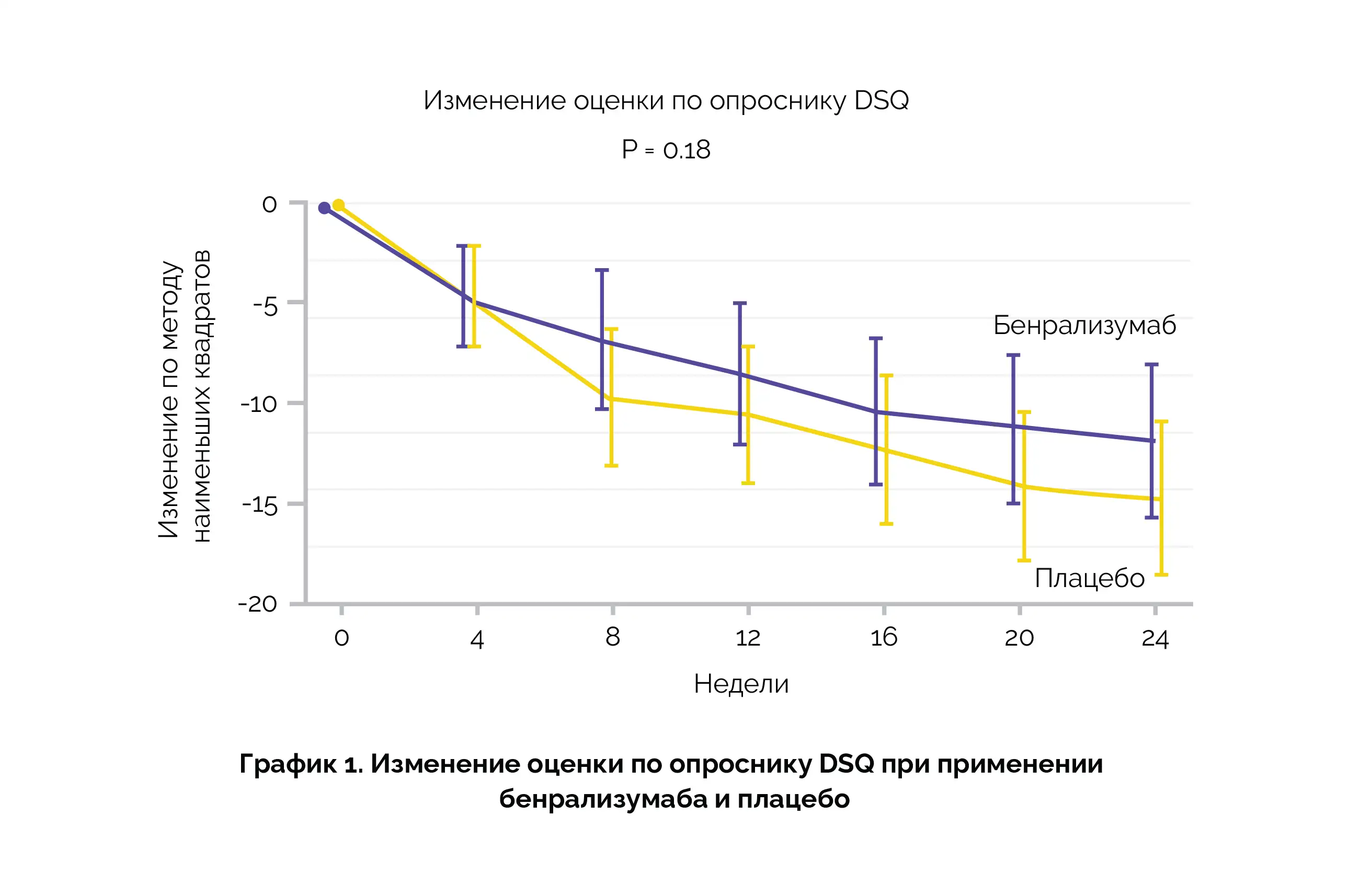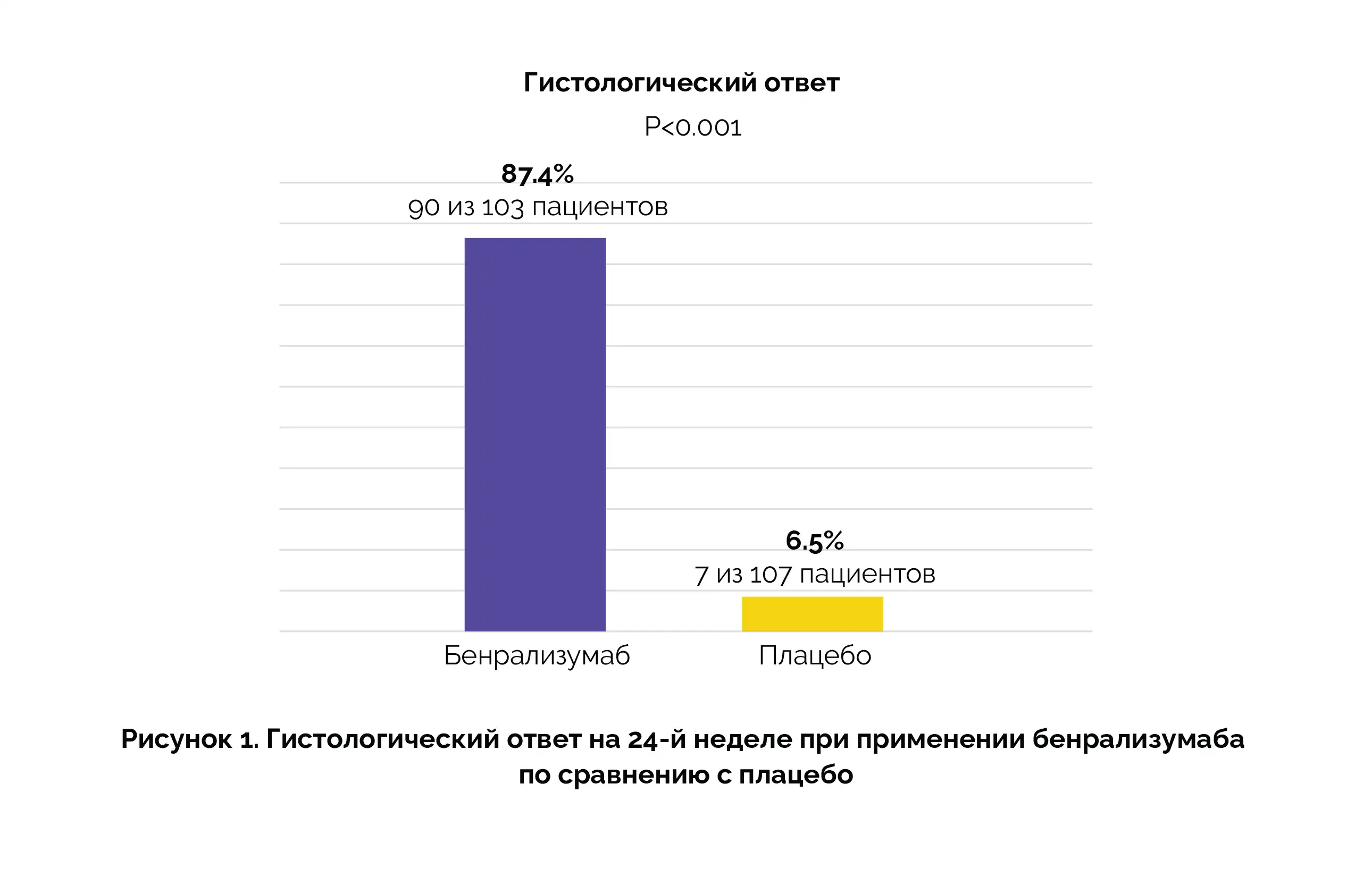 В ходе исследования оценивали гистологический ответ (≤ 6 эозинофилов в поле зрения при большом увеличении) и изменение симптомов дисфагии с использованием опросника симптомов дисфагии (DSQ) через 24 недели. Гистологический ответ через 24 недели был достигнут у 87,4 % пациентов, получавших бенрализумаб, по сравнению с 6,5 % пациентов, получавших плацебо (см. рисунок 1).
