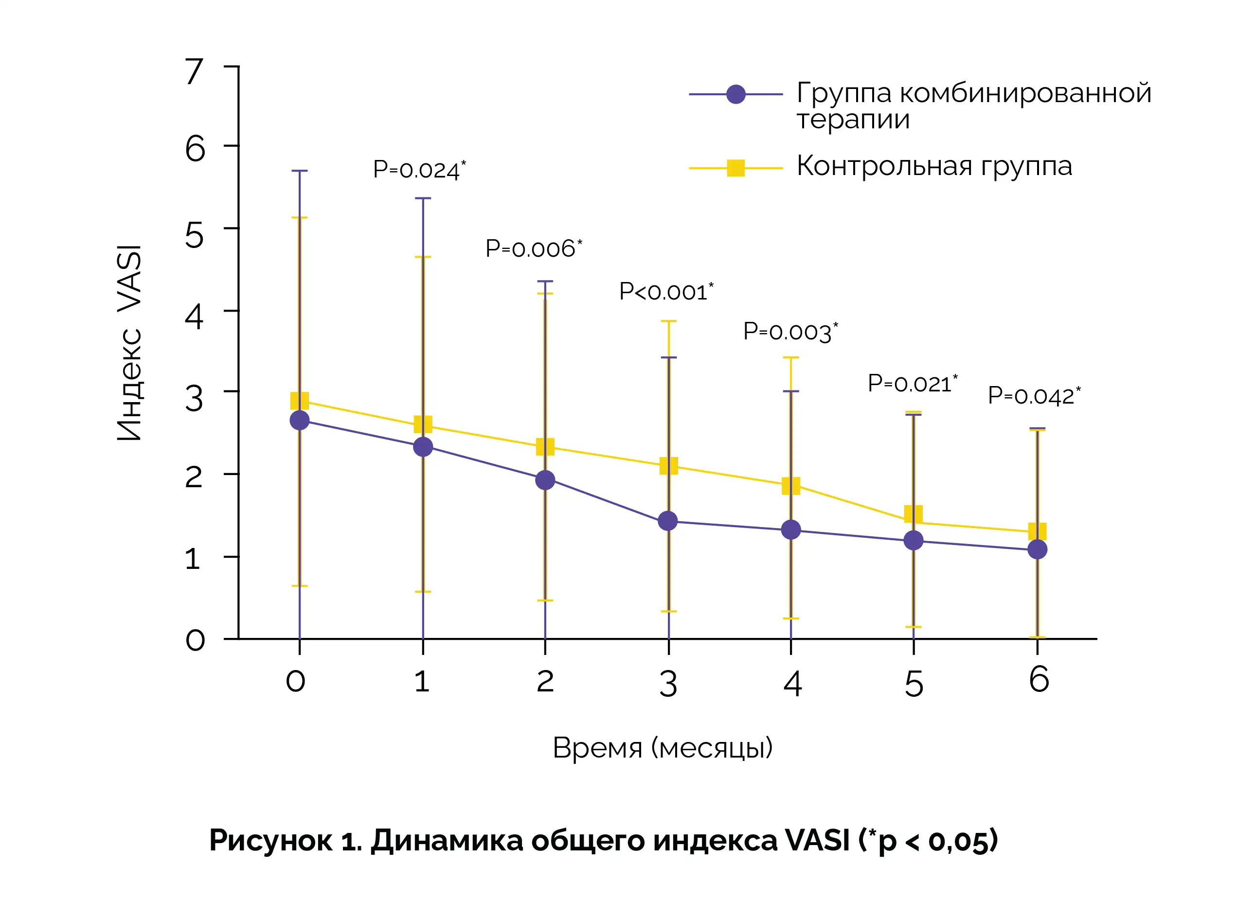 Эффективность оценивали в течение периода лечения продолжительностью 6 месяцев с последующим наблюдением после лечения в течение 6 месяцев для оценки частоты рецидивов. С первого месяца у пациентов в группе комбинированной терапии наблюдалось существенное снижение индекса оценки площади витилиго (VASI) по сравнению с контрольной группой (рисунок 1).