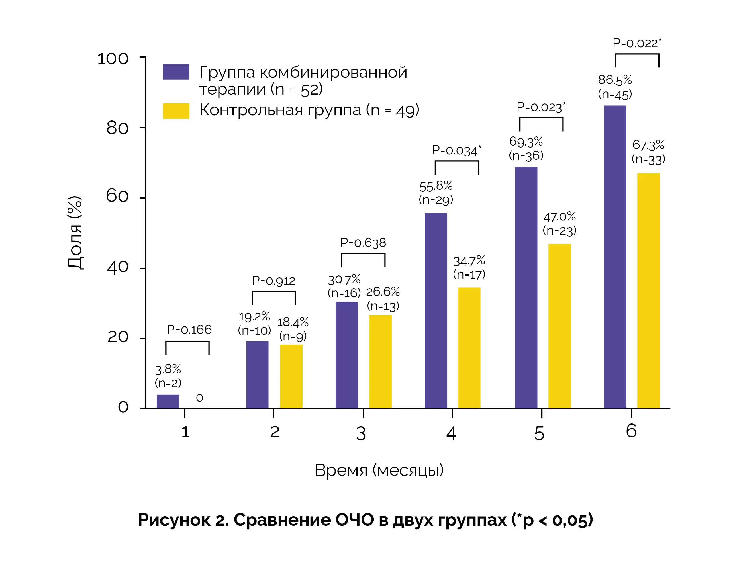 К четвертому месяцу общая частота ответа (ОЧО) в группе комбинированной терапии была значительно выше и достигла 86,5 % к шестому месяцу по сравнению с 67,3 % в контрольной группе (рисунок 2).