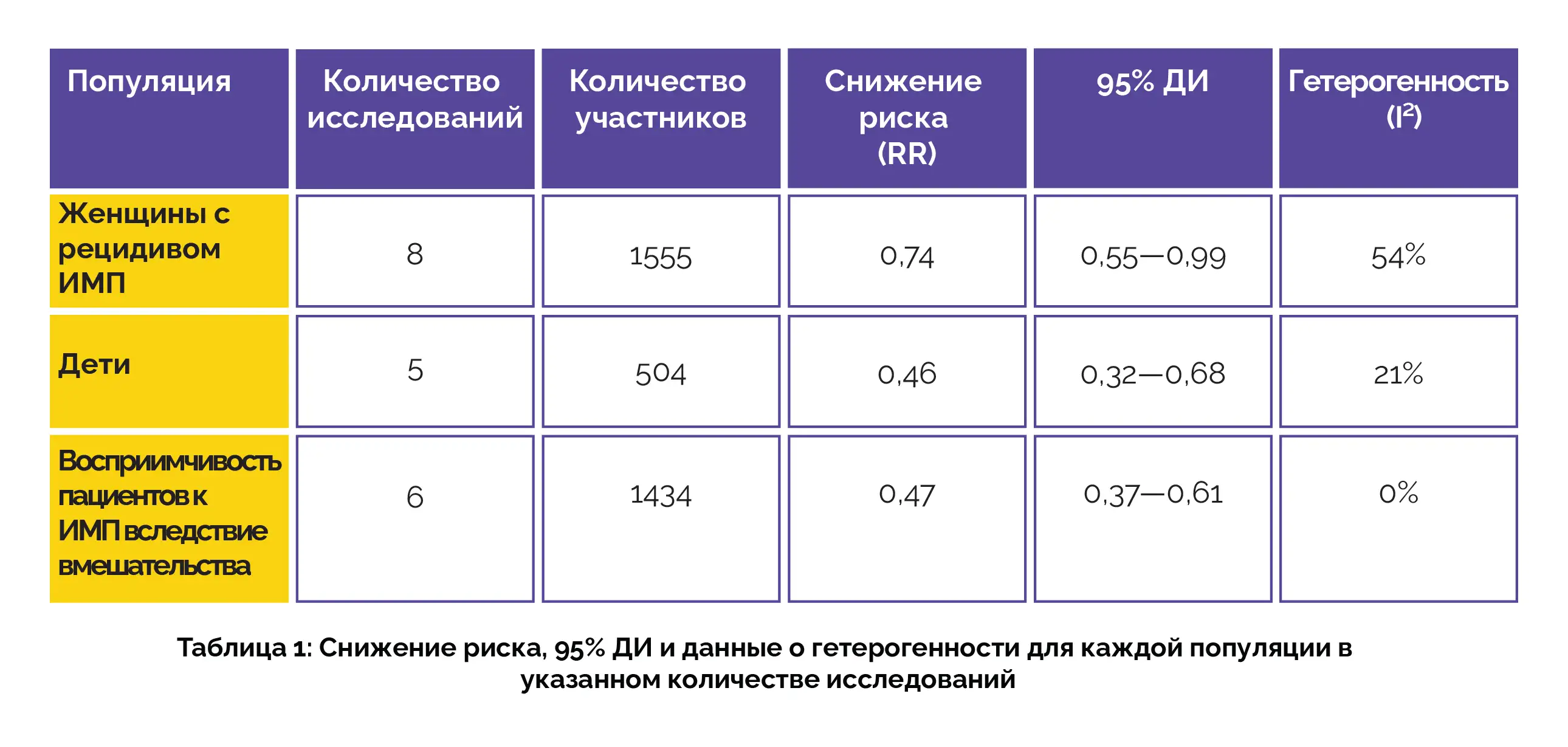 В случаях, когда достоверность доказательств была умеренной, было обнаружено, что клюквенные продукты снижали общий риск ИМП (6211 участников: отношение рисков [RR] 0,70, 95% доверительный интервал [ДИ] от 0,58 до 0,84; I² = 69%). При исследовании конкретных групп участников было обнаружено, что клюквенные продукты, вероятно, снижают риск ИМП, как показано ниже (таблица 1):