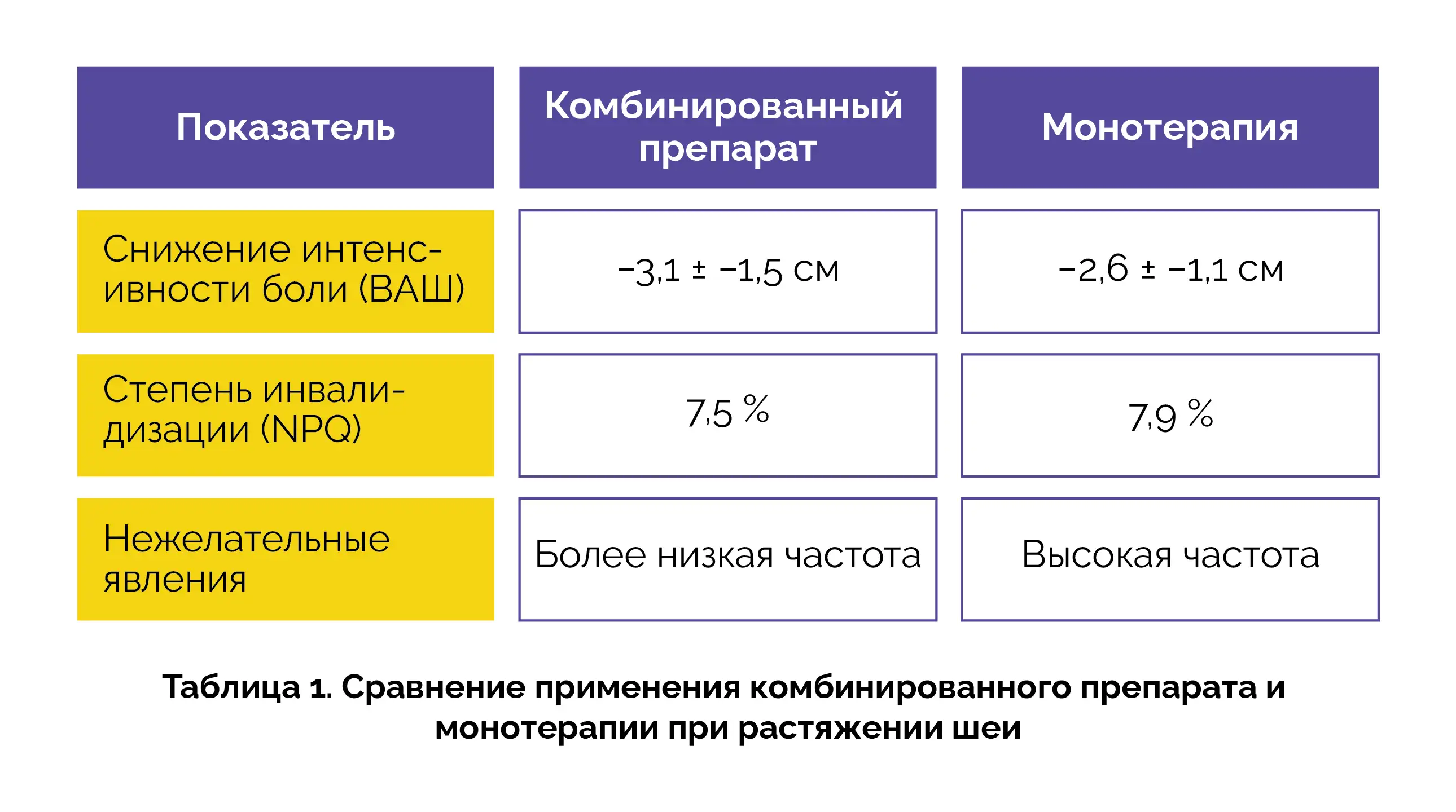 Пациенты принимали препараты внутрь каждые 8 часов в течение 7 дней. Интенсивность боли оценивали с помощью визуальной аналоговой шкалы (ВАШ), а степень инвалидизации — с помощью опросника для оценки боли в шее больницы «Нортвик‑Парк» (NPQ). Терапия комбинированным препаратом обеспечивала снижение интенсивности боли и процентного показателя инвалидизации по сравнению с монотерапией декскетопрофеном, при меньшем количестве нежелательных эффектов (см. таблицу 1).
