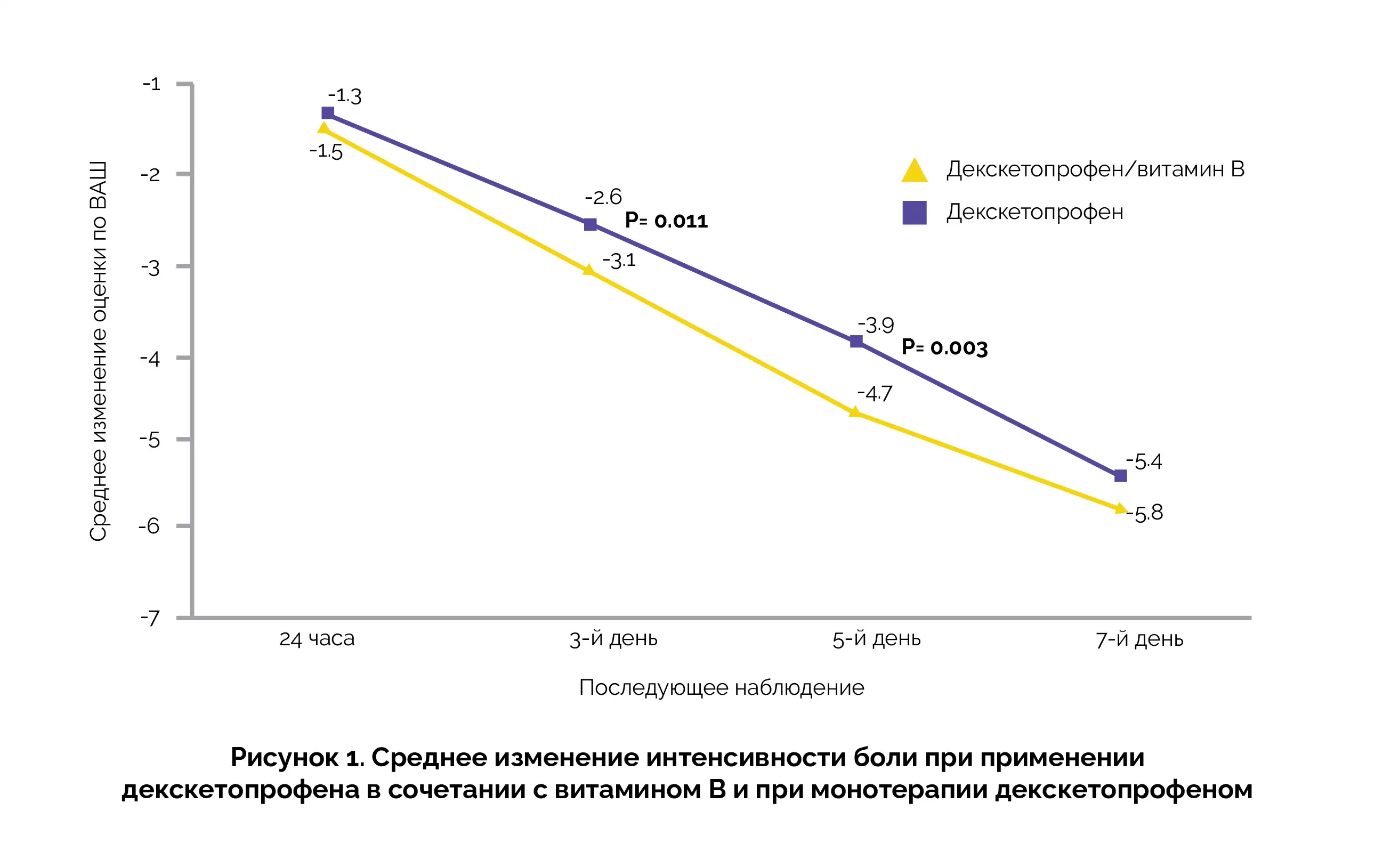 Терапия комбинированным препаратом, содержащим декскетопрофен и витамины группы В, приводила к существенному снижению интенсивности боли начиная с третьего дня и поддерживала это облегчение боли на протяжении всего 7-дневного периода лечения (см. рисунок 1).