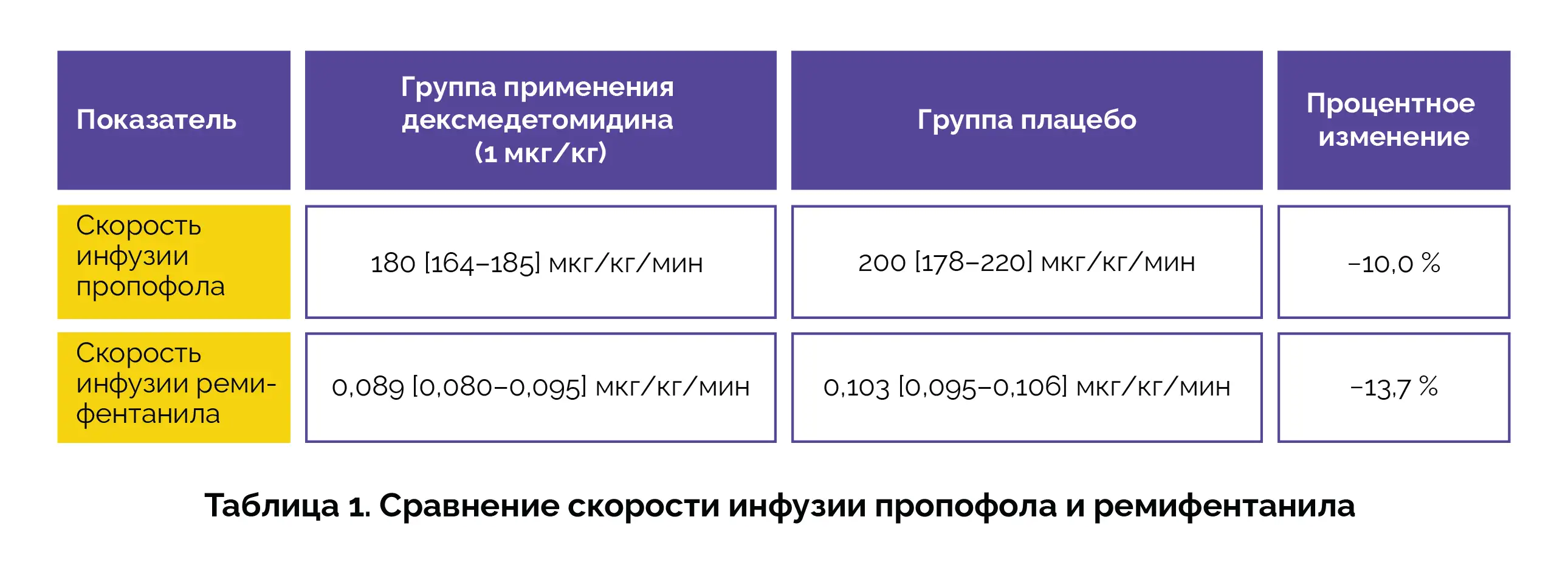 В анализ включили данные 67 пациентов. Применение дексмедетомидина в дозе 1 мкг/кг привело к значительному снижению скорости инфузии как пропофола, так и ремифентанила по сравнению с плацебо — на 10,0 % и 13,7 % соответственно. Эти результаты были статистически значимыми и свидетельствовали о снижении потребности в анестезии в группе дексмедетомидина (см. таблицу 1).
