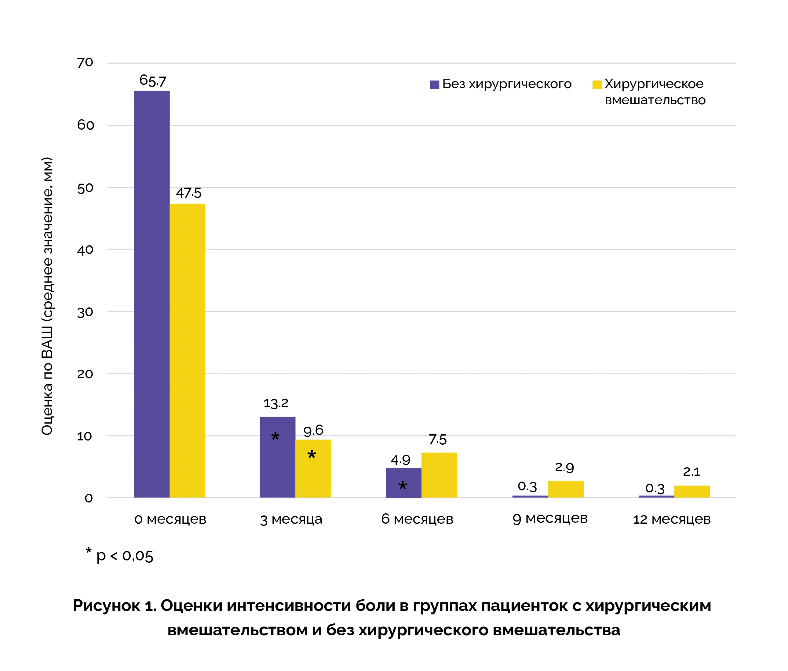 О наличии болевых ощущений сообщили 65 пациенток с эндометриозом. В группе хирургического вмешательства (N = 28) оценки интенсивности боли на исходном уровне (47,5 мм) через 3 месяца резко снизились до 9,6 мм (p < 0,01). Через 6, 9 и 12 месяцев значения составили 7,5 мм, 2,9 мм и 2,1 мм соответственно. Исходная оценка по ВАШ в группе без хирургического вмешательства (N = 37) составила 65,7 мм; через 3 месяца она значимо снизилась до 13,2 мм (p < 0,01), а затем до 4,9 мм (p < 0,05) через 6 месяцев. И через 9, и через 12 месяцев оценка оставалась низкой (на уровне 0,3 мм) (см. рисунок 1).