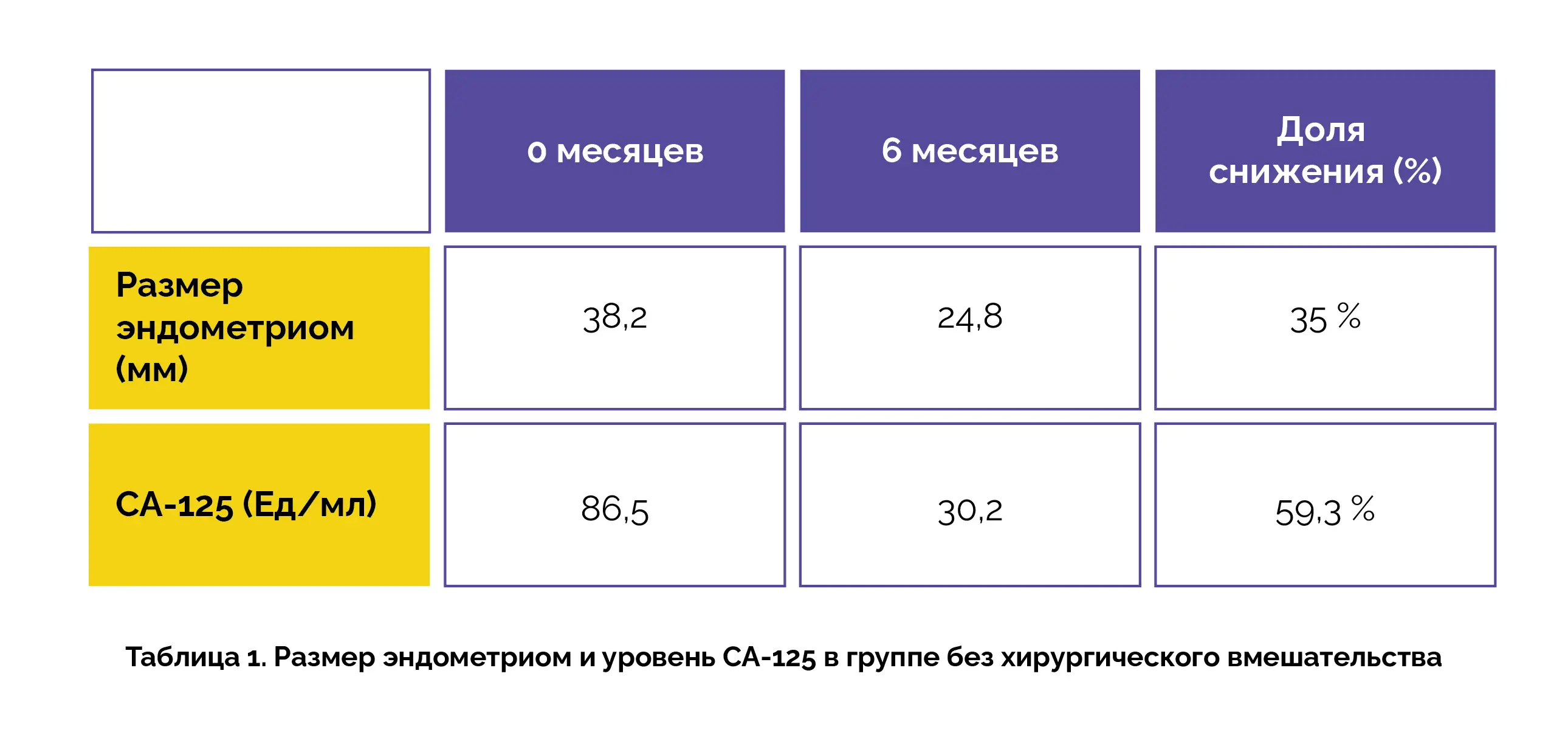 После шести месяцев терапии размер эндометриом и уровень CA-125 в сыворотке статистически значимо уменьшились (см. таблицу 1).