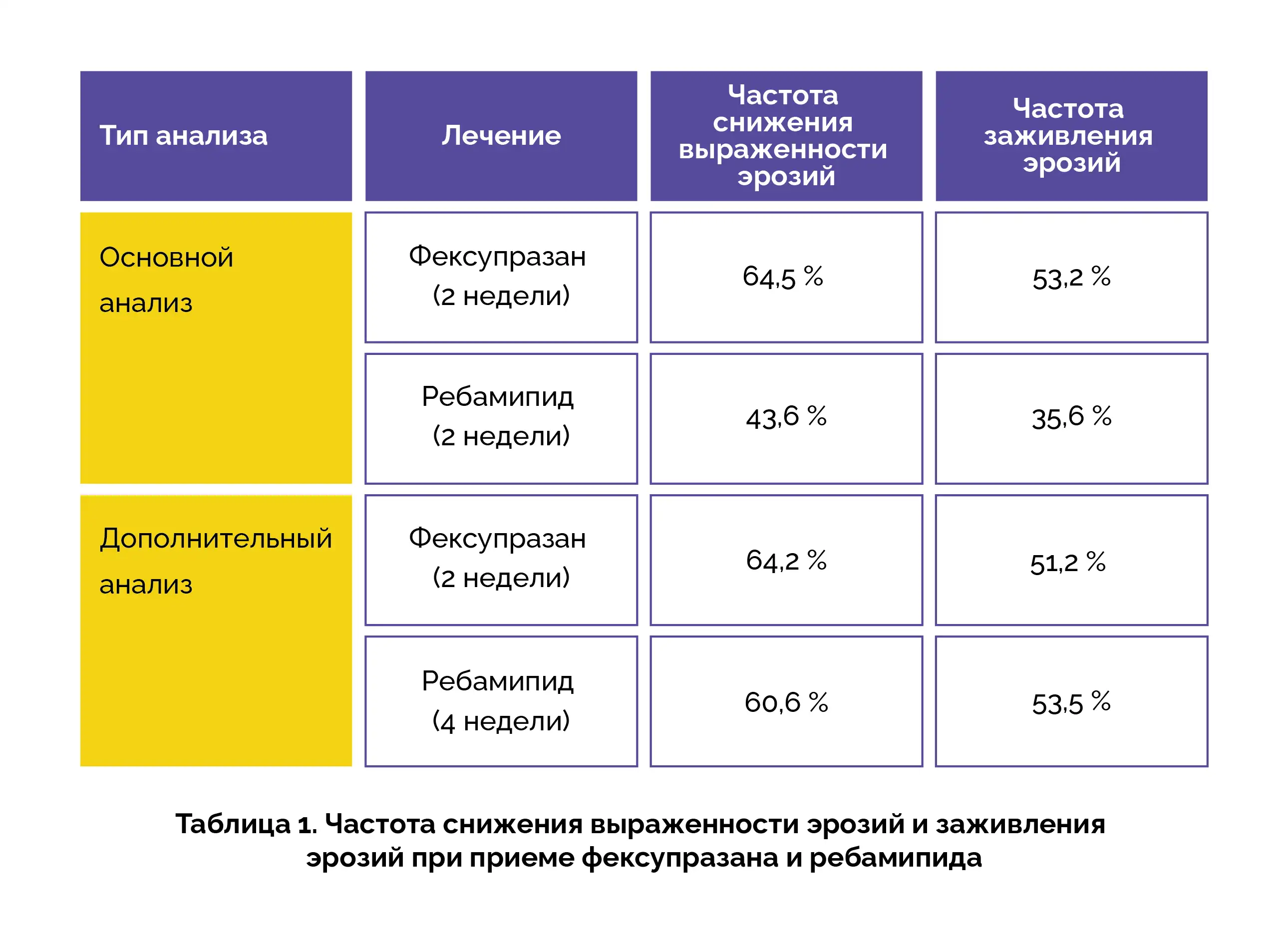 Исследователи оценивали частоту снижения выраженности эрозий и заживления эрозий после двух недель приема фексупразана по сравнению с двумя или четырьмя неделями приема ребамипида, рассчитав разницу рисков и доверительные интервалы для эффектов лечения. По результатам основного анализа частоты снижения выраженности эрозий и заживления эрозий установлена большая эффективность фексупразана по сравнению с ребамипидом. Согласно данным дополнительного анализа, результаты после двух недель лечения фексупразаном аналогичны результатам после четырех недель лечения ребамипидом (таблица 1).