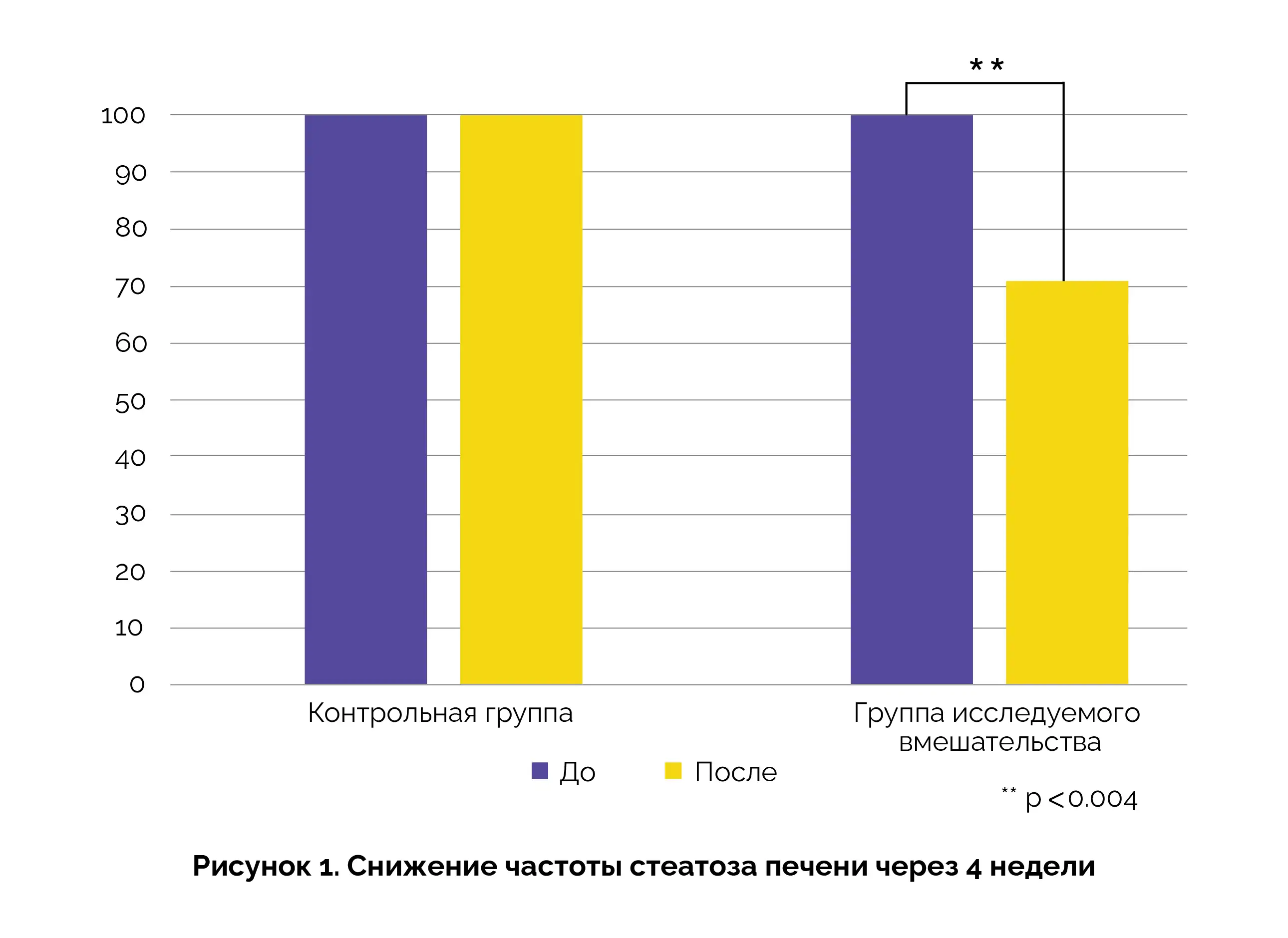 Снижение частоты стеатоза печени после 4 недель употребления цельных апельсинов составило 30 % (p < 0,004), то есть стеатоз печени наблюдался только у 70,9 % участников в группе употребления апельсинов по сравнению со 100 % в контрольной группе (рисунок 1).