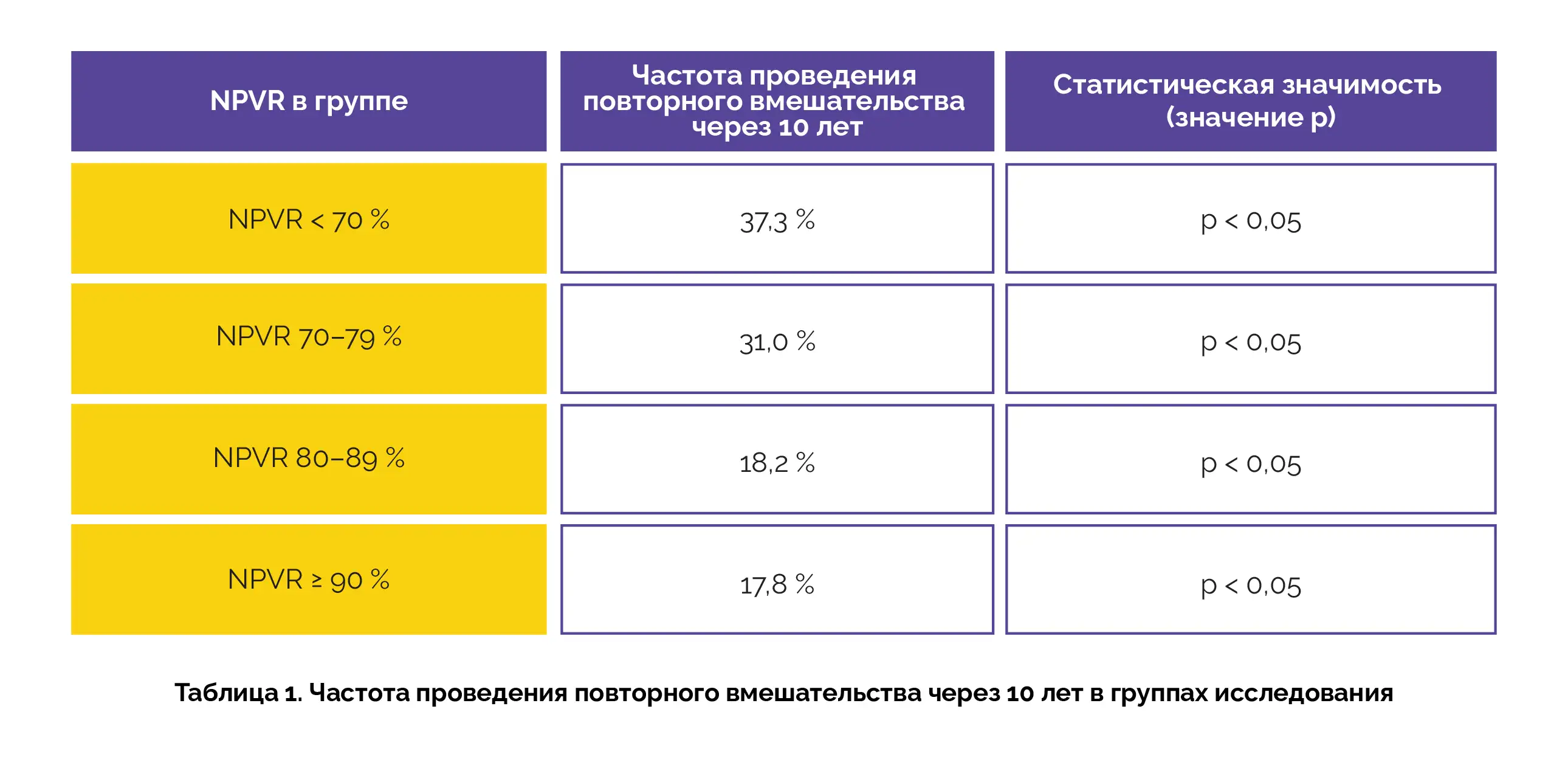 Совокупная частота проведения повторного вмешательства у пациенток, прошедших процедуру USgHIFU, составила 3,4 % через 1 год, 11,8 % через 3 года, 16,8 % через 5 лет, 22,6 % через 8 лет и 24,1 % через 10 лет. Частота проведения повторного вмешательства через 10 лет статистически значимо различалась в четырех группах, выделенных с учетом величины NPVR (см. таблицу 1). Между группами с NPVR 80–89 % и NPVR ≥ 90 % (p = 0,499) статистически значимая разница отсутствовала.