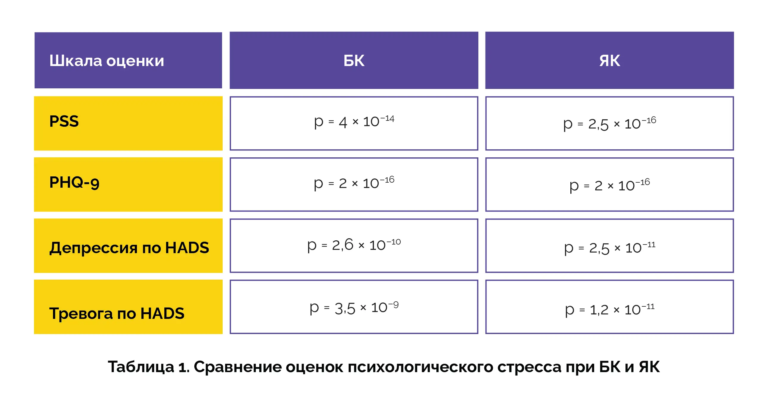 Исследователи оценили стресс, тревогу и депрессию у 50 пациентов с БК, 54 пациентов с ЯК и 100 участников контрольной группы без ВЗК. Для оценки использовали опросники: опросник здоровья пациента (PHQ-9), шкала воспринимаемого стресса (PSS) и госпитальная шкала тревоги и депрессии (HADS). Был проведен анализ связи между психологическими оценками и экспрессией генов IL-17A, IL-17F и IL-23A в слизистой оболочке кишечника пациентов с ВЗК. У пациентов с БК и ЯК наблюдались значимо более высокие оценки по сравнению с участниками контрольной группы (см. таблицу 1 ниже).