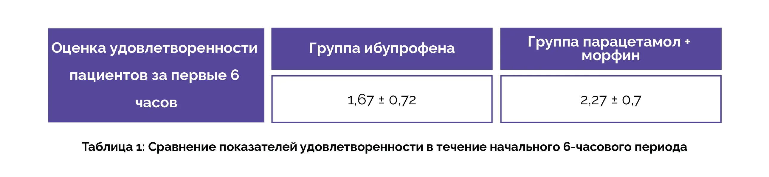 После введения комбинации парацетамол + морфин и ибупрофена оценивали удовлетворенность пациента процедурой и уровень боли. Оценка удовлетворенности пациентов в течение первых 6 часов в группе ибупрофена и в другой группе продемонстрировала статистически значимые различия, как показано в таблице 1: