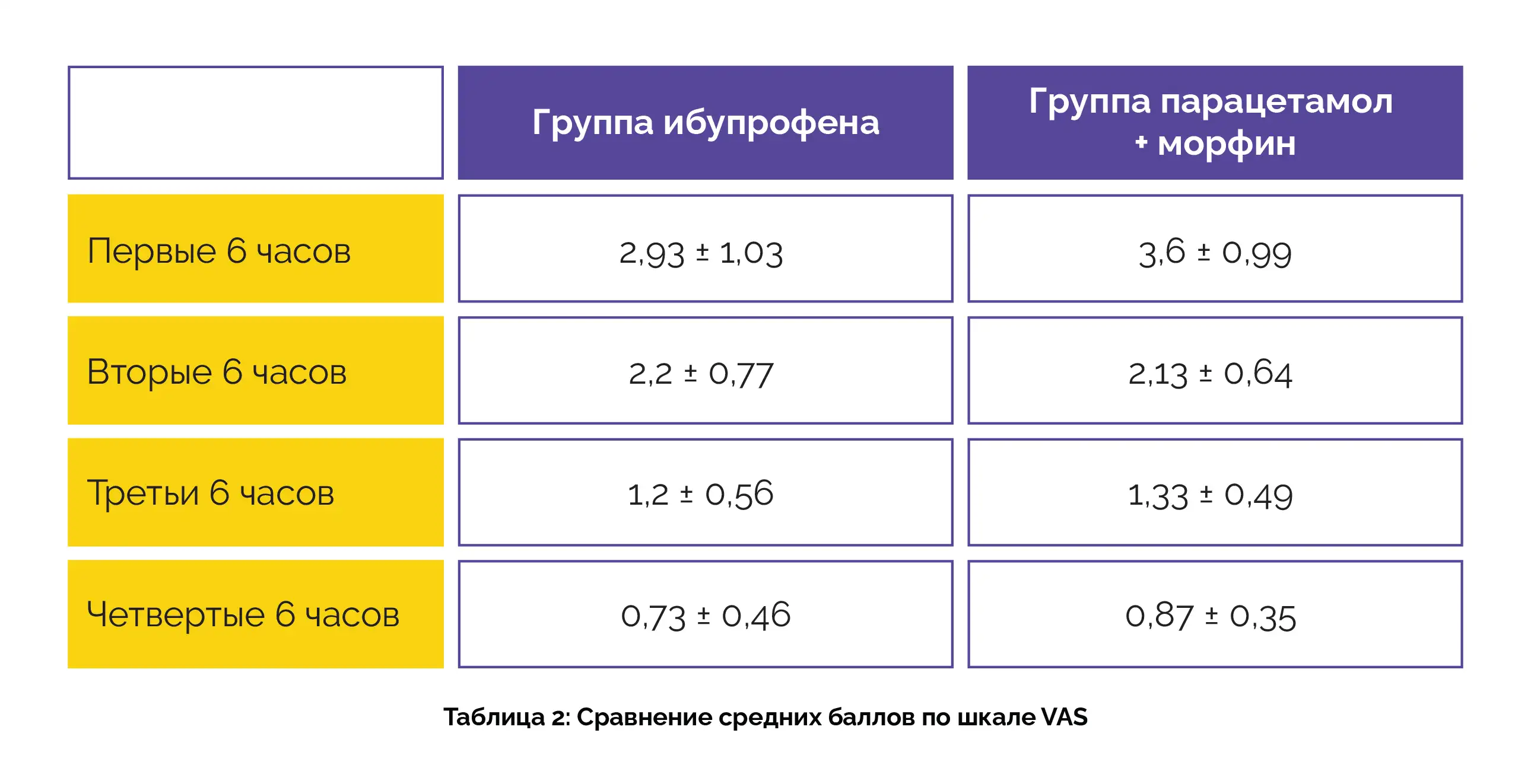 Однако средние значения по визуально-аналоговой шкале (VAS) за первый, второй, третий и четвертый часы не показали статистически значимой разницы, как указано в таблице 2: