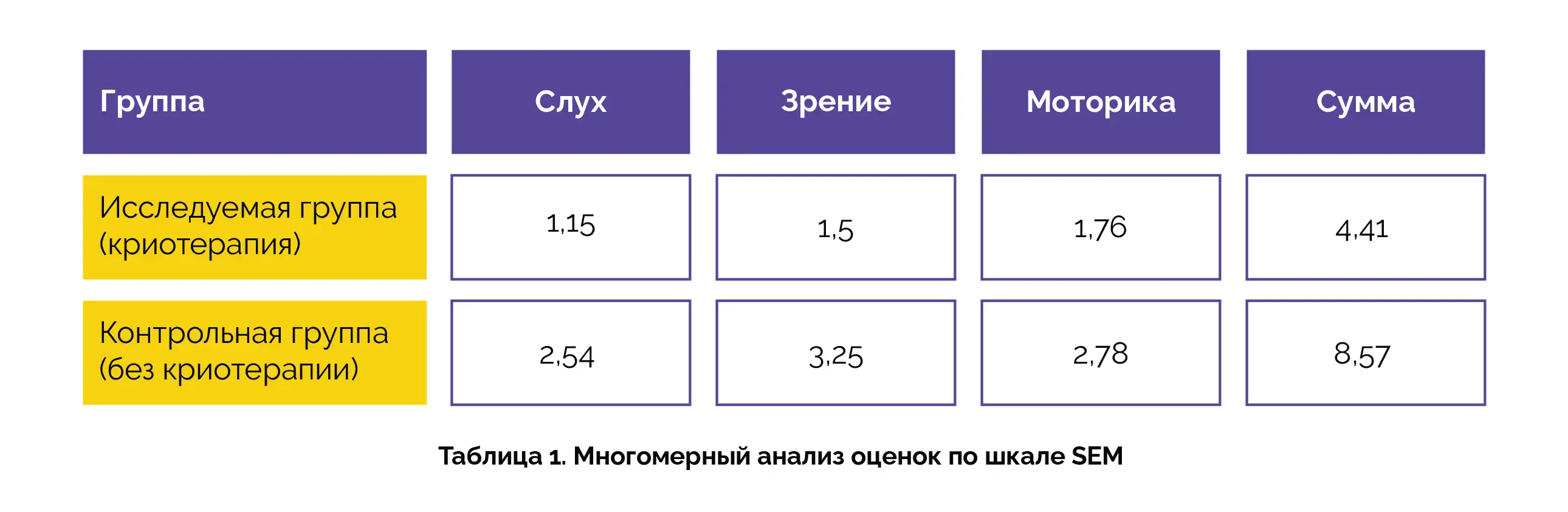 Для оценки изменения интенсивности боли в ответ на вмешательство использовали шкалу оценки слуха, зрения, моторики (SEM). В рамках одномерного анализа между двумя группами не было выявлено статистически значимого различия, при этом в ходе многомерного анализа было выявлено статистически значимое различие (см. таблицу 1).