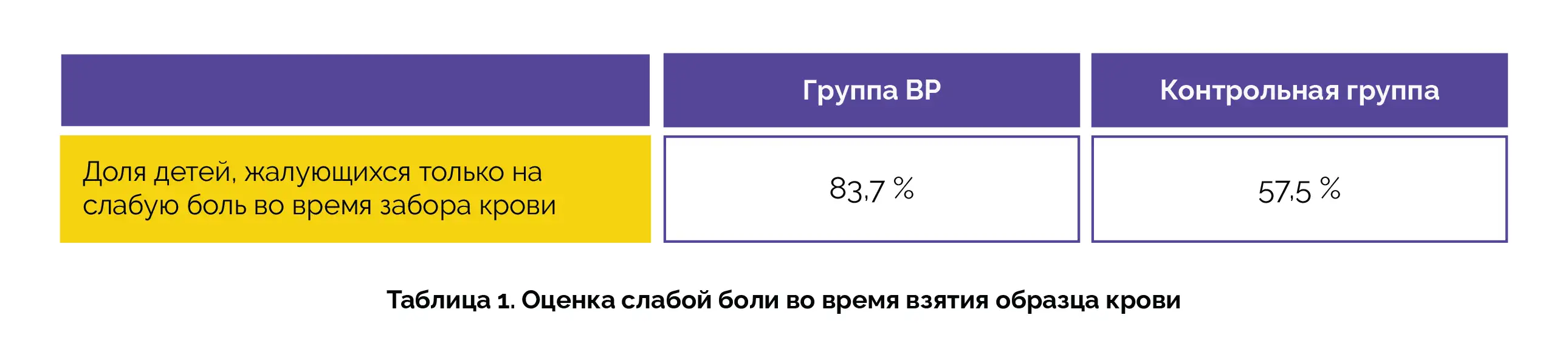 Применение технологии виртуальной реальности эффективно облегчает боль и снижает уровень тревоги при проведении венопункции у детей в возрасте 7–12 лет.