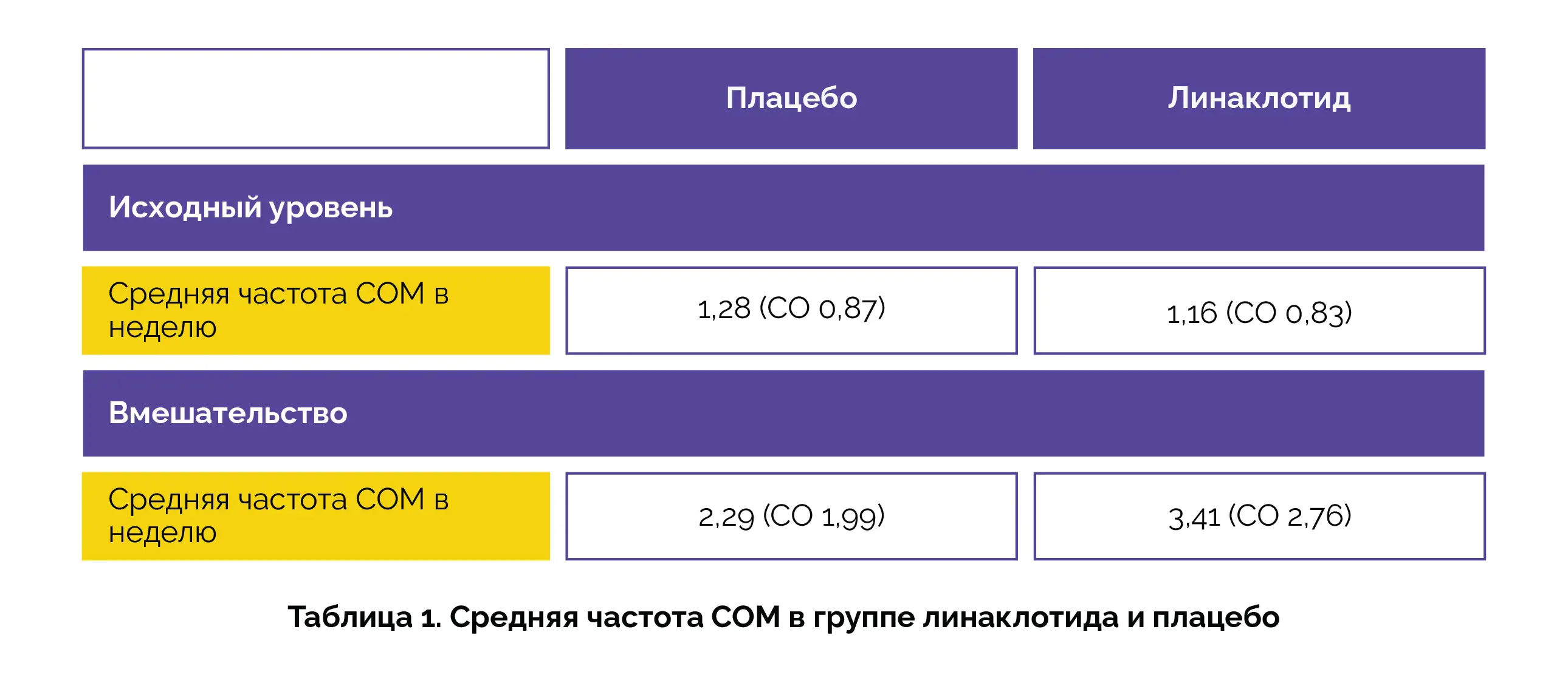 С 1 октября 2019 г. по 21 марта 2022 г. в исследование были включены 330 детей, которых рандомизировали в группу линаклотида (n = 166) или плацебо (n = 164). Конечные точки безопасности и эффективности оценивали у 328 пациентов (по 164 пациента в каждой группе), поскольку 2 ребенка в группе линаклотида не получили ни одной дозы исследуемого препарата. Указанный период лечения завершили 293 ребенка (89 %). Из 328 пациентов 181 (55 %) ребенок был женского пола и 147 (45 %) — мужского пола. Средняя частота СОМ на исходном уровне и во время вмешательства представлена в таблице 1.