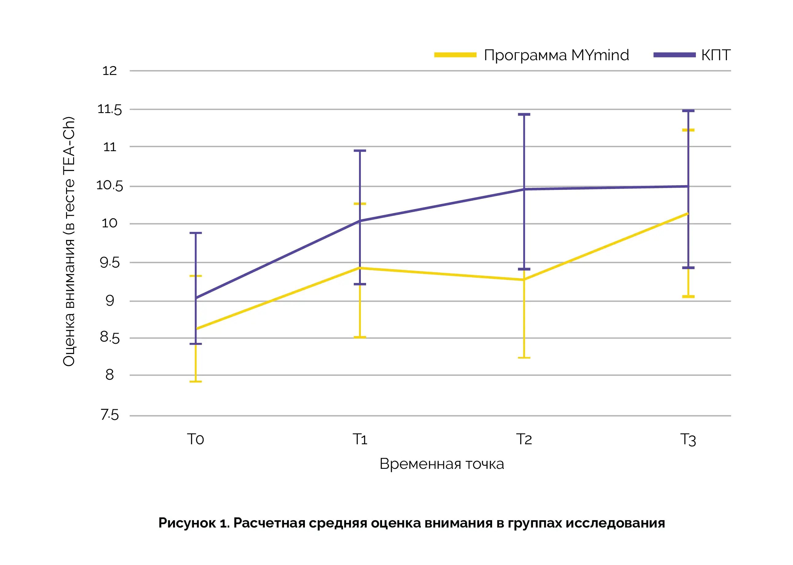 Оценку в рамках исследования выполняли на исходном уровне (T0), непосредственно после проведения вмешательств (T1) и в период последующего наблюдения через три (T2) и шесть месяцев (T3). Основной конечной точкой была оценка внимания с использованием задания «Поиск в небе» (англ. Sky Search) из Детского теста повседневного внимания (TEA-Ch). Дополнительными конечными точками были оценки поведения ребенка и факторов, связанных с родителями. После проведения как программы MYmind, так и КПТ было выявлено статистически значимое улучшение оценки внимания у детей через 6 месяцев. Уровень бета в группе проведения программы MYmind составил 1,48 (p = 0,013, d Коэна = 0,32), а в группе КПТ — 1,46 (p = 0,008, d = 0,27) (см. рисунок 1).