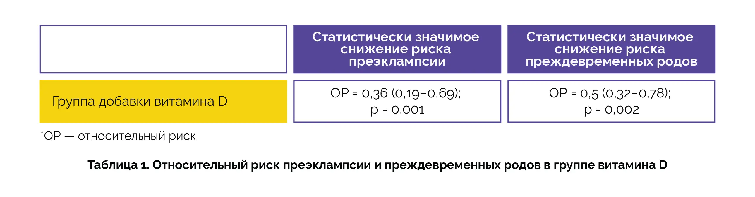 Данное простое слепое клиническое исследование проводили в 14 медицинских учреждениях дородовой помощи на территории Демократической Республики Конго с 1 марта 2020 года по 30 июня 2021 года. В исследование были включены 1300 женщин (медиана возраста матери: 21 год, медиана срока беременности: 15 недель) с первой беременностью. Участниц рандомизировали на получение витамина D (холекальциферола) внутрь один раз в месяц в дозе 60 000 МЕ (группа А) в течение 6 месяцев или в контрольную группу (группа В). Уровень 25(OH)D в сыворотке крови оценивали при включении в исследование и на 34-й неделе беременности. Оценку конечных точек проводили ежемесячно до родов. У женщин в группе витамина D наблюдалось статистически значимое снижение вероятности развития преэклампсии и преждевременных родов (таблица 1).