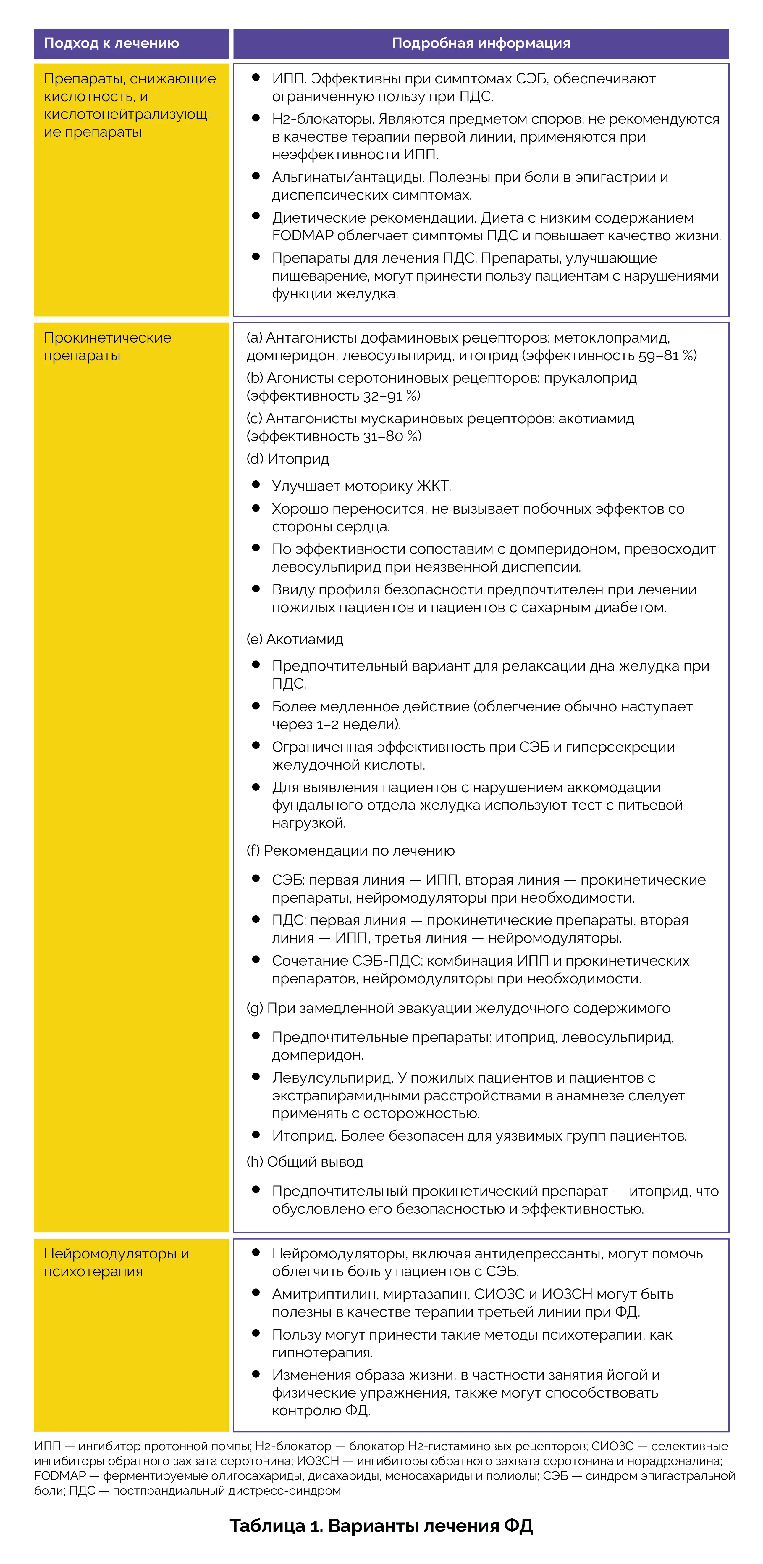 Лечение ФД включает комбинированную терапию препаратами, снижающими кислотность, прокинетическими препаратами и нейромодуляторами, подобранными с учетом конкретного подтипа заболевания. Ингибиторы протонной помпы (ИПП) эффективны при подтипе ФД с синдромом эпигастральной боли (СЭБ), при этом прокинетические препараты, такие как итоприд, предпочтительны при постпрандиальном дистресс-синдроме (ПДС). В случаях рефрактерного заболевания при неэффективности методов терапии первой линии можно рассмотреть целесообразность применения нейромодуляторов и психотерапии, в частности селективных ингибиторов обратного захвата серотонина (СИОЗС) и гипнотерапии. Через 4–6 недель лечение следует пересмотреть с целью корректировки терапии в зависимости от наблюдаемого у пациента ответа. В таблице 1 обобщены данные о различных методах лечения ФД.