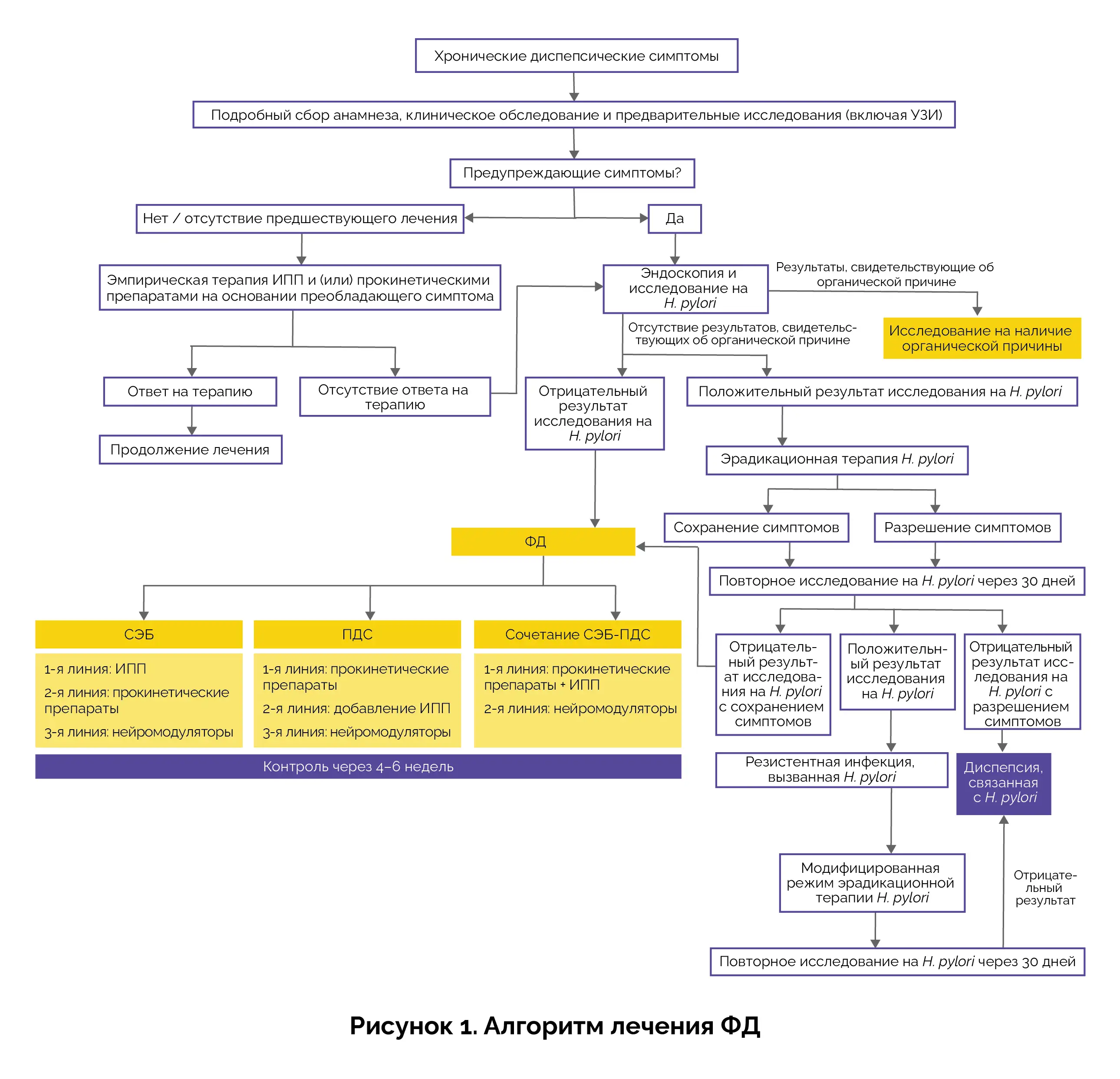 Разработанный экспертами алгоритм предполагает поэтапный подход к лечению, начинающийся с комплексной оценки состояния пациента и выявления предупреждающих симптомов. Лечение подбирается индивидуально на основании симптомов или подтипа ФД — ЭПС, ПДС или сочетание ЭПС-ПДС (рисунок 1).