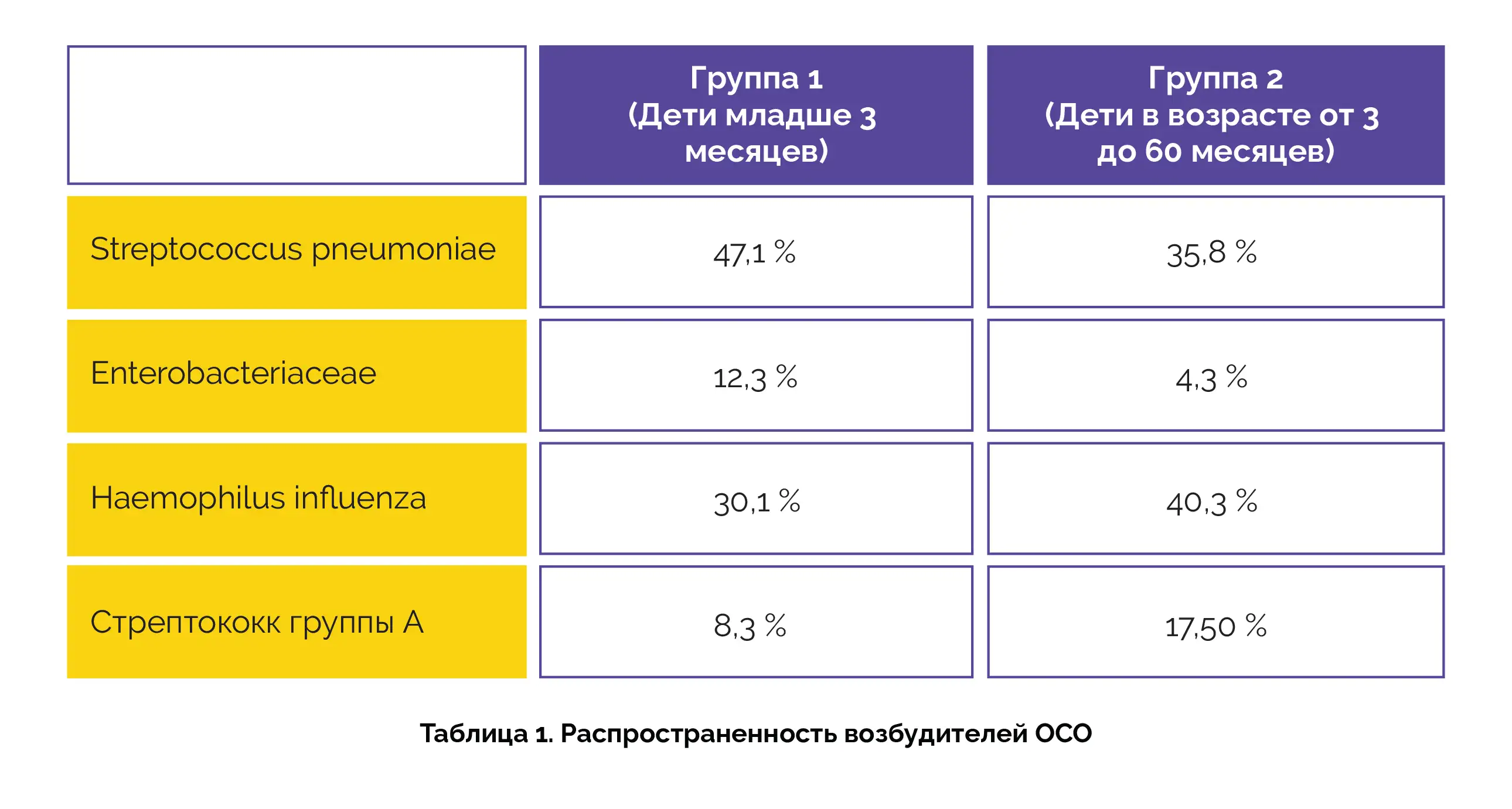 1. Различия в распространенности. В исследовании было выявлено статистически значимое различие в распространенности основных патогенов между новорожденными (группа 1) и детьми более старшего возраста (группа 2). В группе 1 распространенность Streptococcus pneumoniae и Enterobacteriaceae была выше, чем в группе 2. С другой стороны, в группе 2 была выше распространенность Haemophilus influenza и стрептококка группы А (см. таблицу 1).