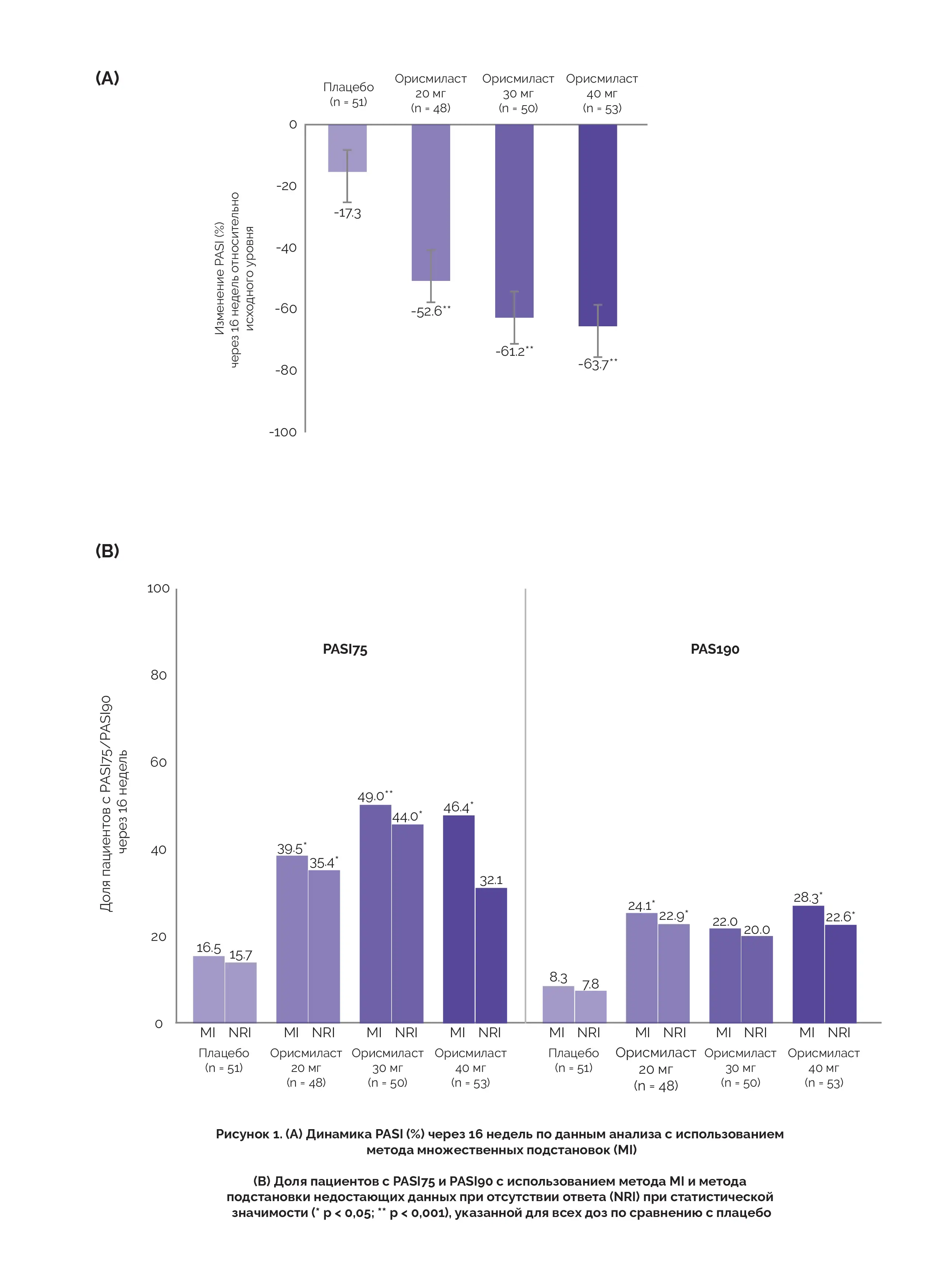 Ключевыми вторичными показателями эффективности были снижение PASI на 75 % (PASI75), отсутствие высыпаний на коже на уровне «чистая кожа» (0) или «почти чистая кожа» (1), а также улучшение общей оценки исследователем на >2 балла (IGA 0/1) через 16 недель. Исходные характеристики 202 рандомизированных пациентов в разных группах были сопоставимы. Исключение составила более высокая доля пациентов с тяжелой формой заболевания в группе применения орисмиласта по сравнению с группой плацебо.