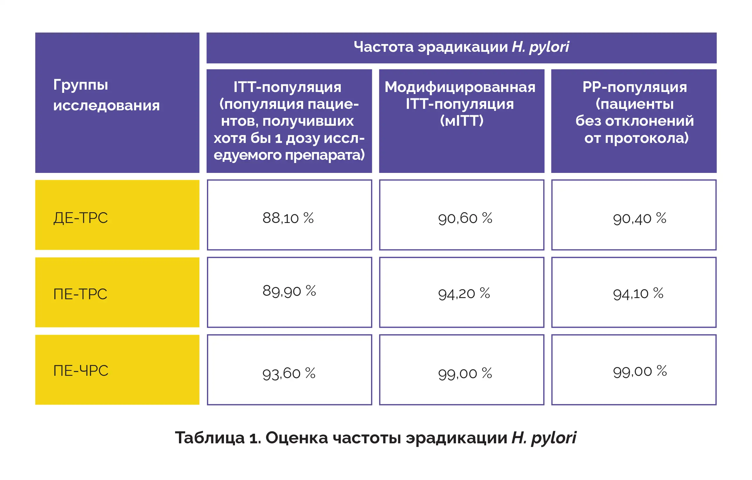 В рамках исследования 327 участников с инфекцией, вызванной H. pylori, рандомизировали в одну из трех групп на получение комбинации вонопразана 20 мг два раза в сутки и амоксициллина в одном из трех режимов дозирования: 1000 мг три раза в сутки до еды (ДЕ-ТРС), 1000 мг три раза в день после еды (ПЕ-ТРС) или 750 мг четыре раза в сутки после еды (ПЕ-ЧРС) в течение 14 дней. Исследователи сравнивали частоту эрадикации, частоту нежелательных явлений, соблюдение режима лечения и резистентность к антибиотикам в этих группах. Частота эрадикации в соответствии с анализом популяции пациентов, получивших хотя бы 1 дозу исследуемого препарата (ITT-популяция), модифицированной ITT-популяции (мITT-популяция) и популяции без отклонений от протокола (PP-популяция) в группах ДЕ-ТРС, ПЕ-ТРС и ПЕ-ЧРС представлена в таблице 1 ниже.