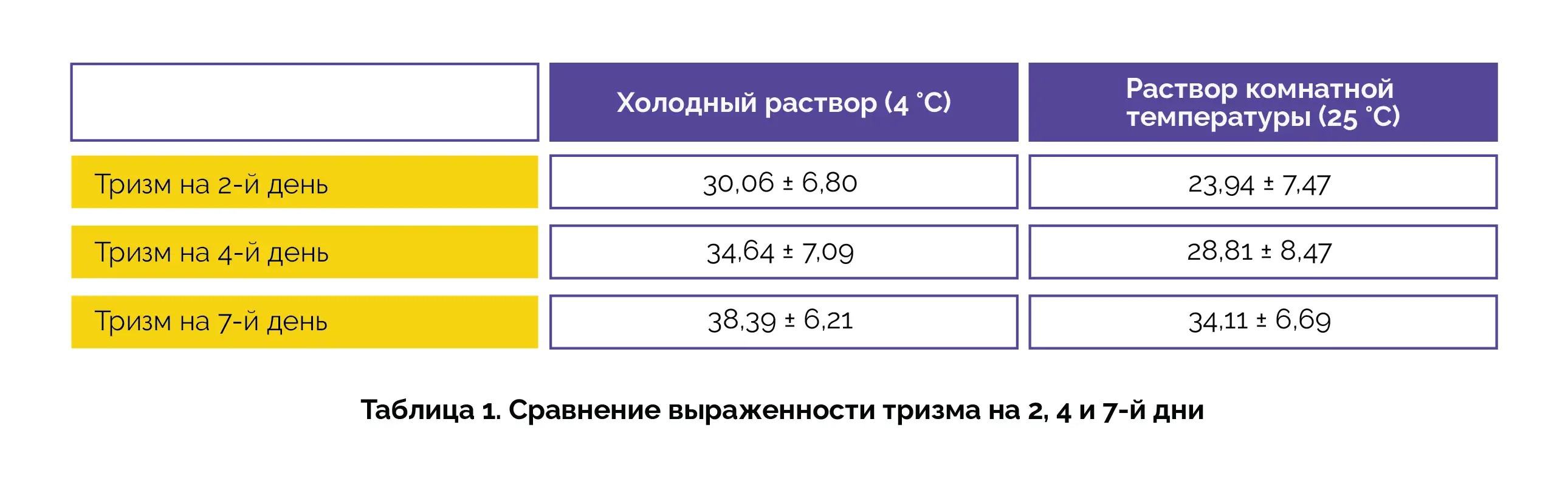 Для парных сравнений использовали U-критерий Манна — Уитни. Для сравнения групп использовали критерий знаковых рангов Уилкоксона. Существенных различий между исследуемыми группами в отношении интенсивности боли и отека выявлено не было. В отношении тризма, максимальное открывание рта, наблюдаемое при использовании холодного физиологического раствора, было заметно лучше, чем при ирригации раствором комнатной температуры, на протяжении всех послеоперационных периодов, как показано в таблице 1.