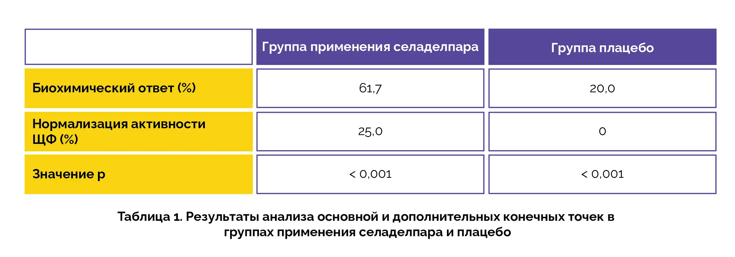 Из общего числа пациентов 93,8 % получали урсодиол в качестве стандартной фоновой терапии. Достижение биохимического ответа в группе применения селаделпара было отмечено у большего числа пациентов по сравнению с группой плацебо. Кроме того, в группе применения селаделпара чаще наблюдалась нормализация активности ЩФ (p < 0,001; см. таблицу 1).