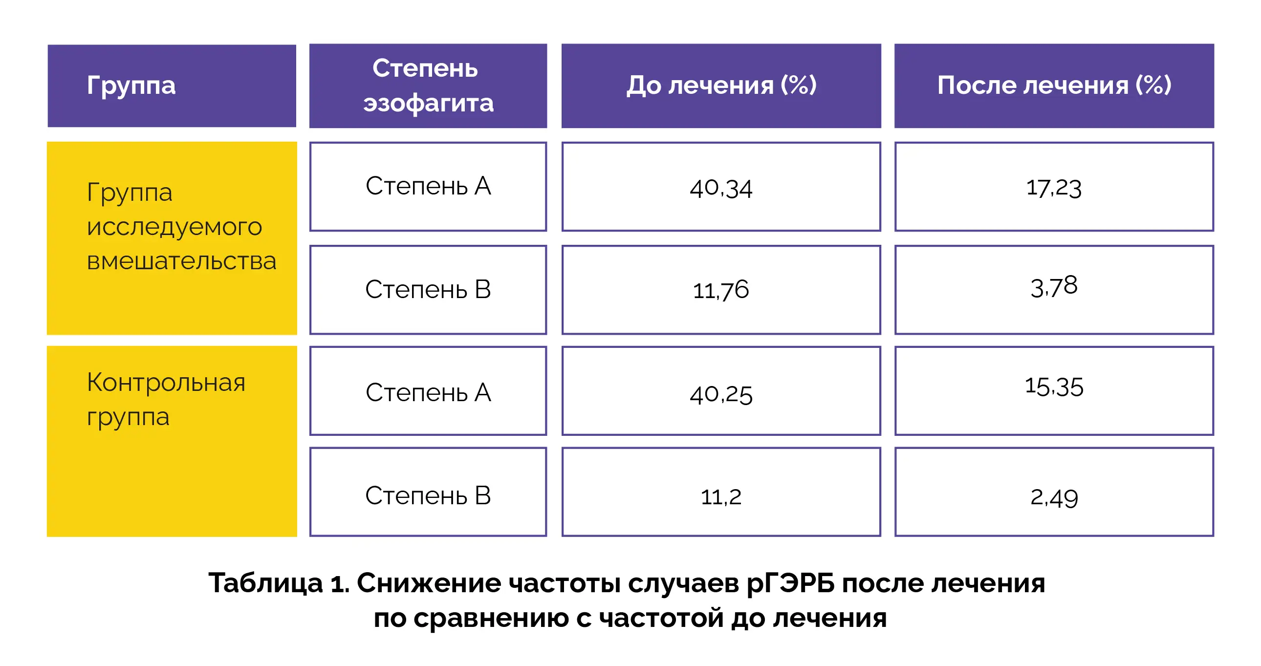 В группе исследуемого лечения общая клиническая эффективность лечения симптомов была выше, а общие оценки симптомов были ниже, чем в контрольной группе. Кроме того, у участников группы исследуемого лечения снижение оценок основных симптомов рГЭРБ, включая изжогу, боль за грудиной, регургитацию, отрыжку и отрыжку кислым, было более выраженным, чем в контрольной группе. В группе исследуемого лечения (Z = 8,169) и контрольной группе (Z = 9,800) наблюдалось значимое снижение степени воспаления пищевода, что свидетельствует о сопоставимой эффективности (см. таблицу 1).