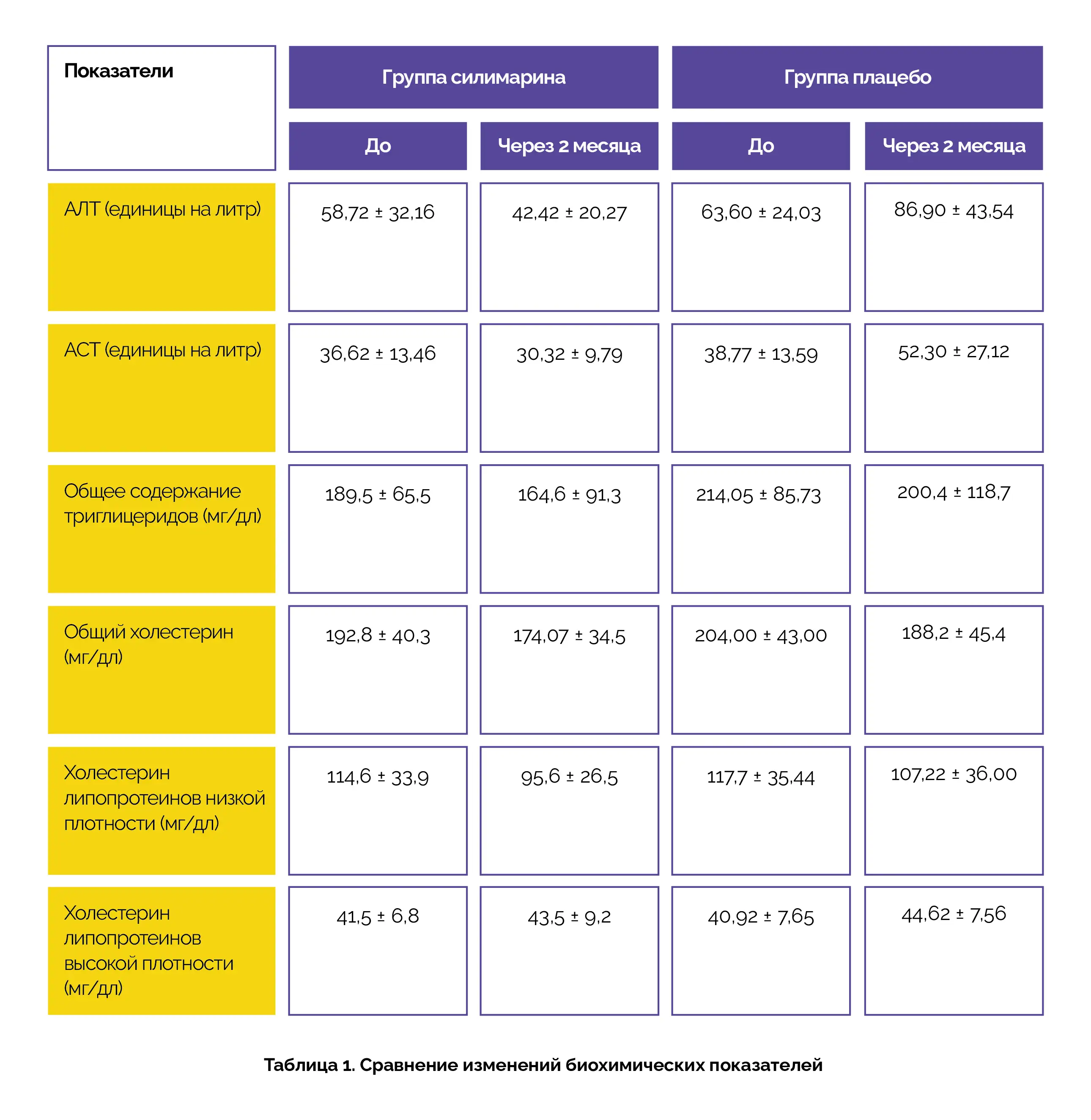 Результаты свидетельствуют, что применение силимарина приводило к статистически значимому снижению уровней аланинаминотрансферазы (АЛТ) и аспартатаминотрансферазы (АСТ) по сравнению с группой плацебо. Кроме того, в группе силимарина наблюдалось клинически значимое снижение уровней холестерина липопротеинов низкой плотности, общего холестерина и триглицеридов, при этом в отношении уровня холестерина липопротеинов высокой плотности статистически значимых статистических различий не наблюдалось (см. таблицу 1).