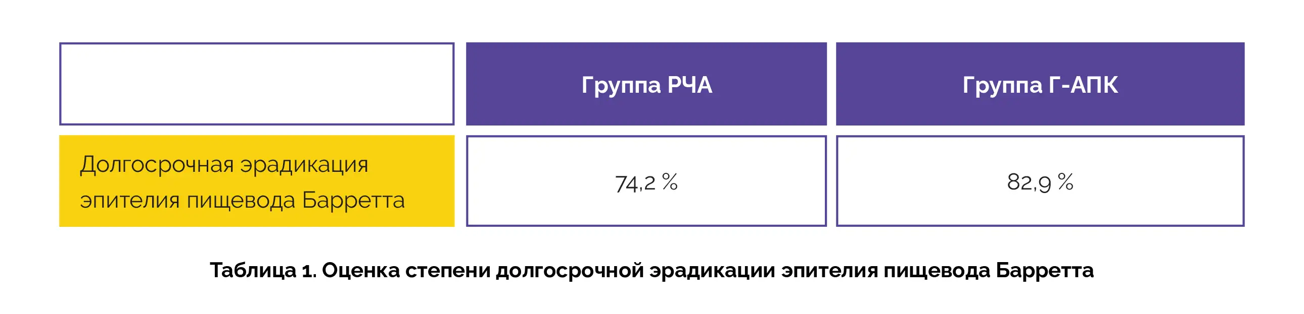 Статистически значимые различия отмечены в интенсивности послеоперационной боли: в группе РЧА средняя интенсивность составила 4,56/10 при длительности боли 7,54 дня, в группе Г-АПК — 2,07/10 при продолжительности боли 3,59 дня. Развитие стеноза, требующего вмешательства, наблюдалось у 3,7 % пациентов в группе Г-АПК и 14,9 % пациентов в группе РЧА. Таким образом, обе методики абляции эффективны с точки зрения степени эрадикации эпителия, однако у методики Г-АПК есть небольшое преимущество.