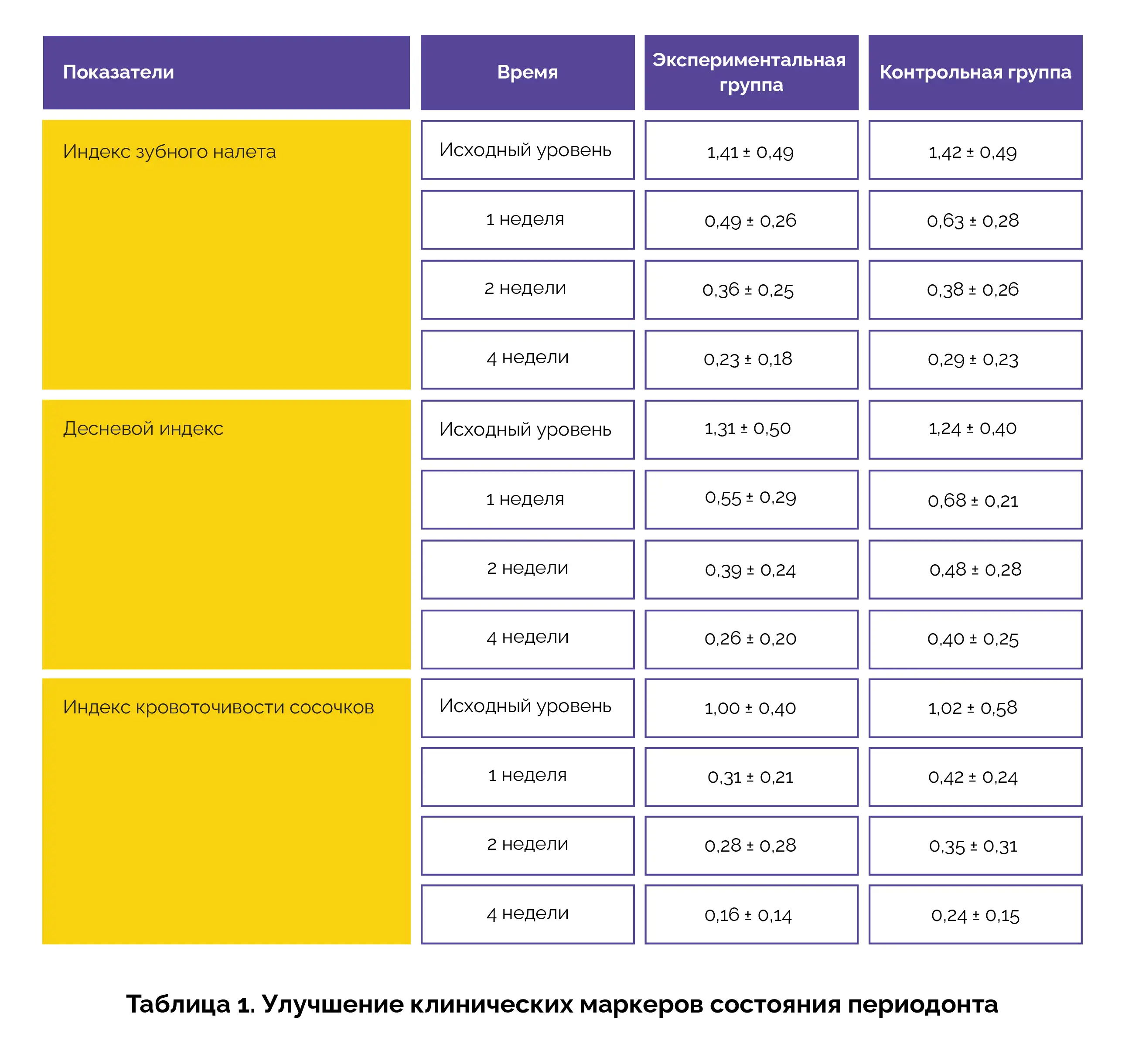 В течение 4 недель в обеих группах наблюдались значимые улучшения клинических маркеров состояния периодонта. В экспериментальной группе отмечались существенно более низкие значения индекса зубного налета через 1 неделю, десневого индекса через 4 недели и индекса кровоточивости сосочков через 4 недели по сравнению с контрольной группой (p < 0,05) (см. таблицу 1).
