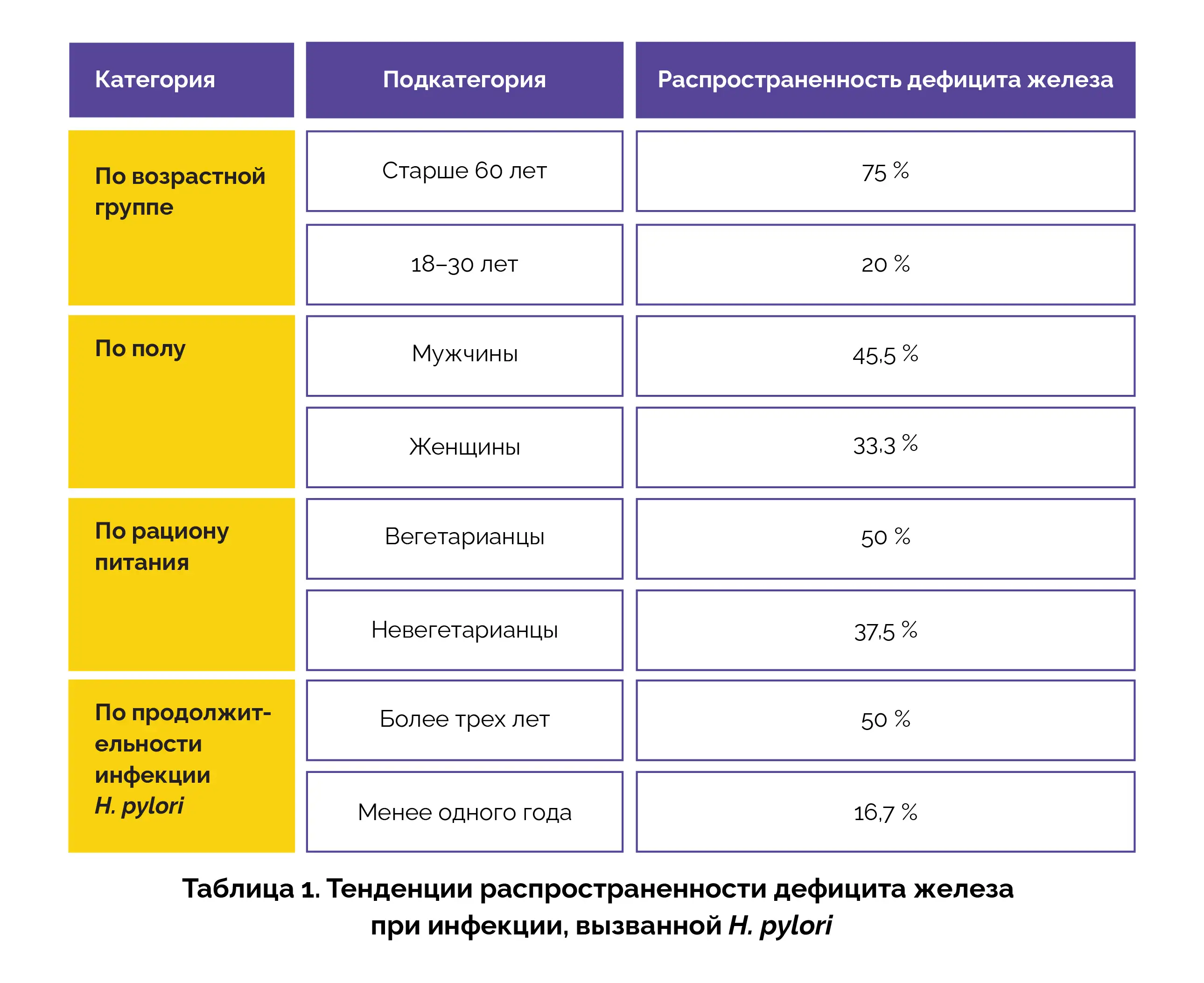 Дефицит железа часто встречается у пациентов с инфекцией, вызванной H. pylori, особенно у лиц пожилого возраста, мужского пола, лиц с высокой продолжительностью инфекции и вегетарианцев.