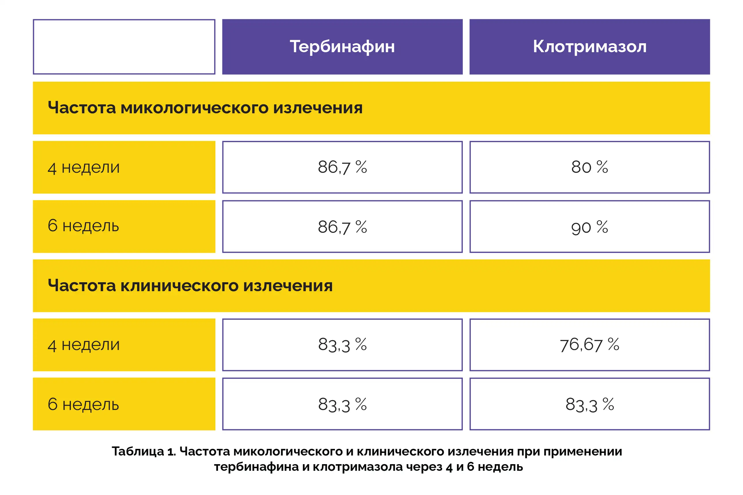 Наружное применение тербинафина в течение одной недели было более предпочтительным методом лечения по причине небольшой длительности курса и фунгицидной активности, обеспечивающих более высокую приверженность пациентов терапии и более благоприятные результаты лечения. Более подробные данные об эффективности (частоте микологического и клинического излечения) при наружном применении двух препаратов представлены в таблице 1.