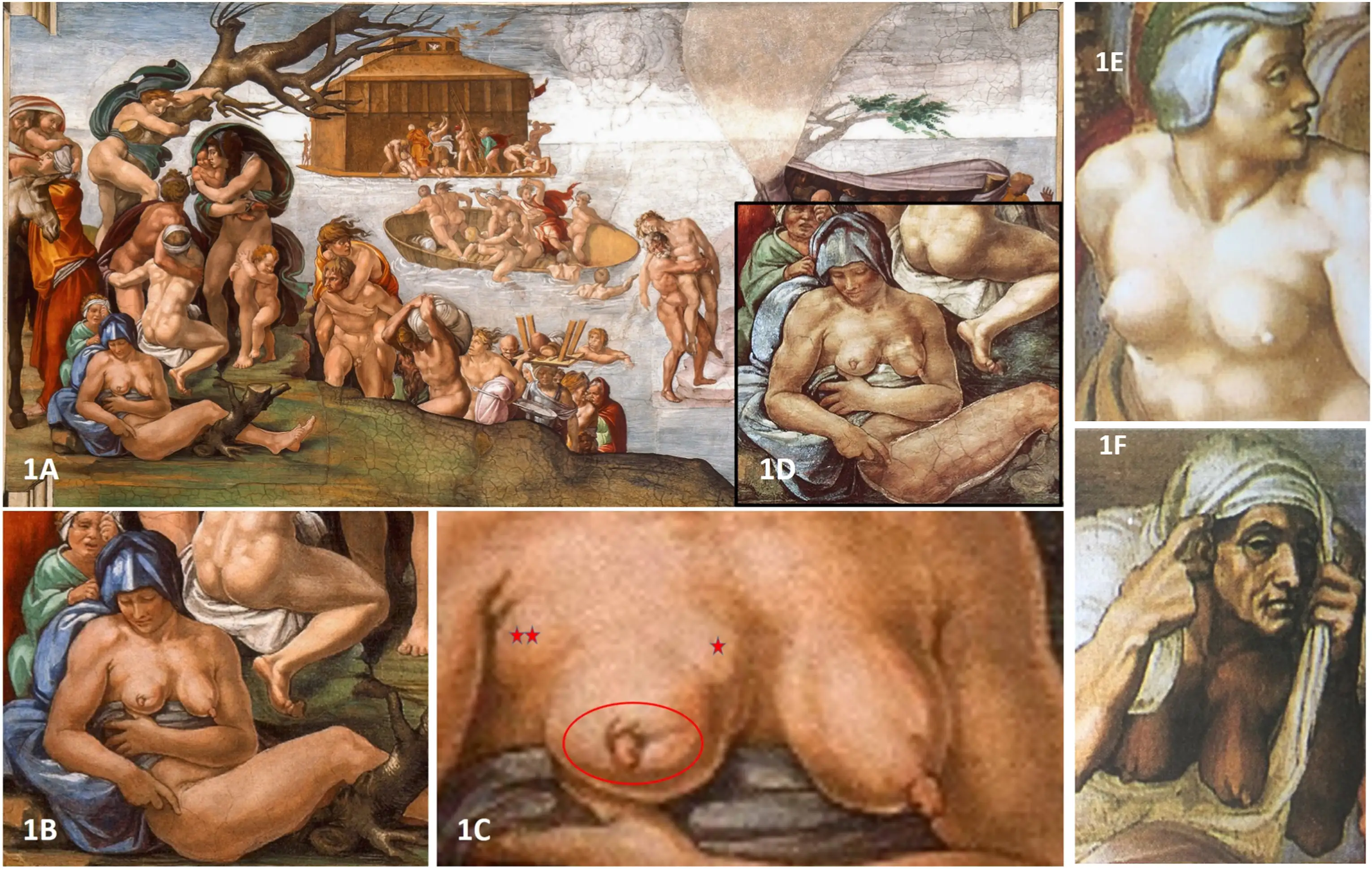 Речь идет о фреске, изображающей Великий потоп, на которой можно заметить женщину, чье тело лишь отчасти прикрывает голубой плащ. Ее молочные железы ассиметричны: левая грудь выглядит нормально, а кроме того, кажется, что именно она использовалась для выкармливания ребенка. На правой же сосок сильно втянут, ареола имеет нетипичную форму, на коже заметна так называемая «апельсиновая корка», а подмышечные лимфоузлы увеличены.