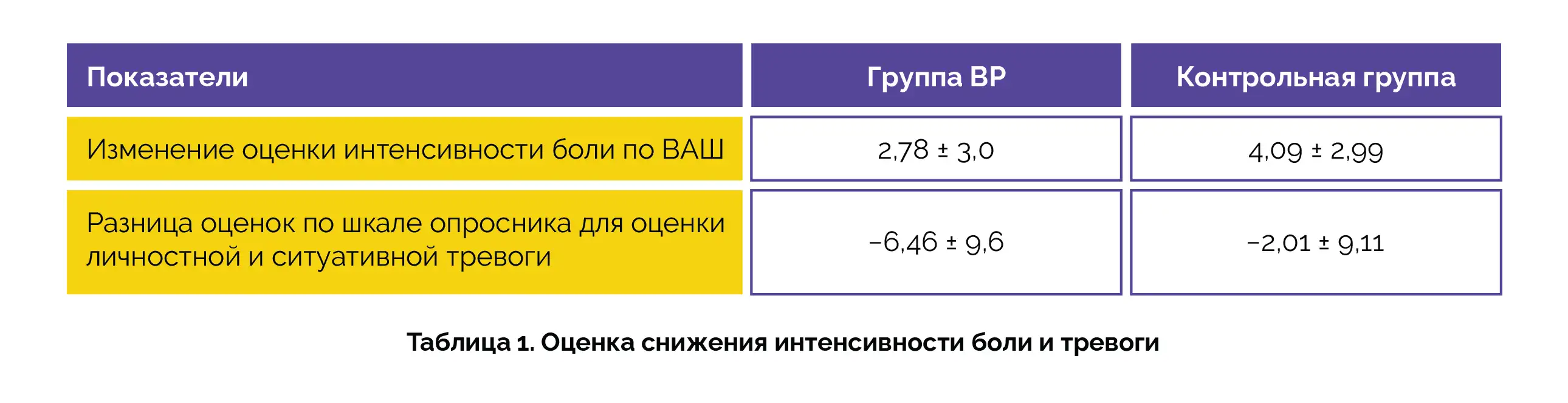Статистически значимых различий между группами по индексу массы тела, гестационному возрасту на момент включения, показаниям к индукции родов, возрасту, предпроцедурной оценке по ВАШ или уровню тревоги не наблюдалось. Основная конечная точка, соответствующая изменению оценки по ВАШ (максимальная оценка во время процедуры минус исходная оценка до процедуры), в группе ВР была существенно ниже по сравнению с контрольной группой. Кроме того, в группе ВР был зарегистрирован более высокий уровень снижения тревоги, о чем свидетельствует разница между оценками по опроснику для оценки личностной и ситуативной тревоги до и после процедуры (см. таблицу 1).