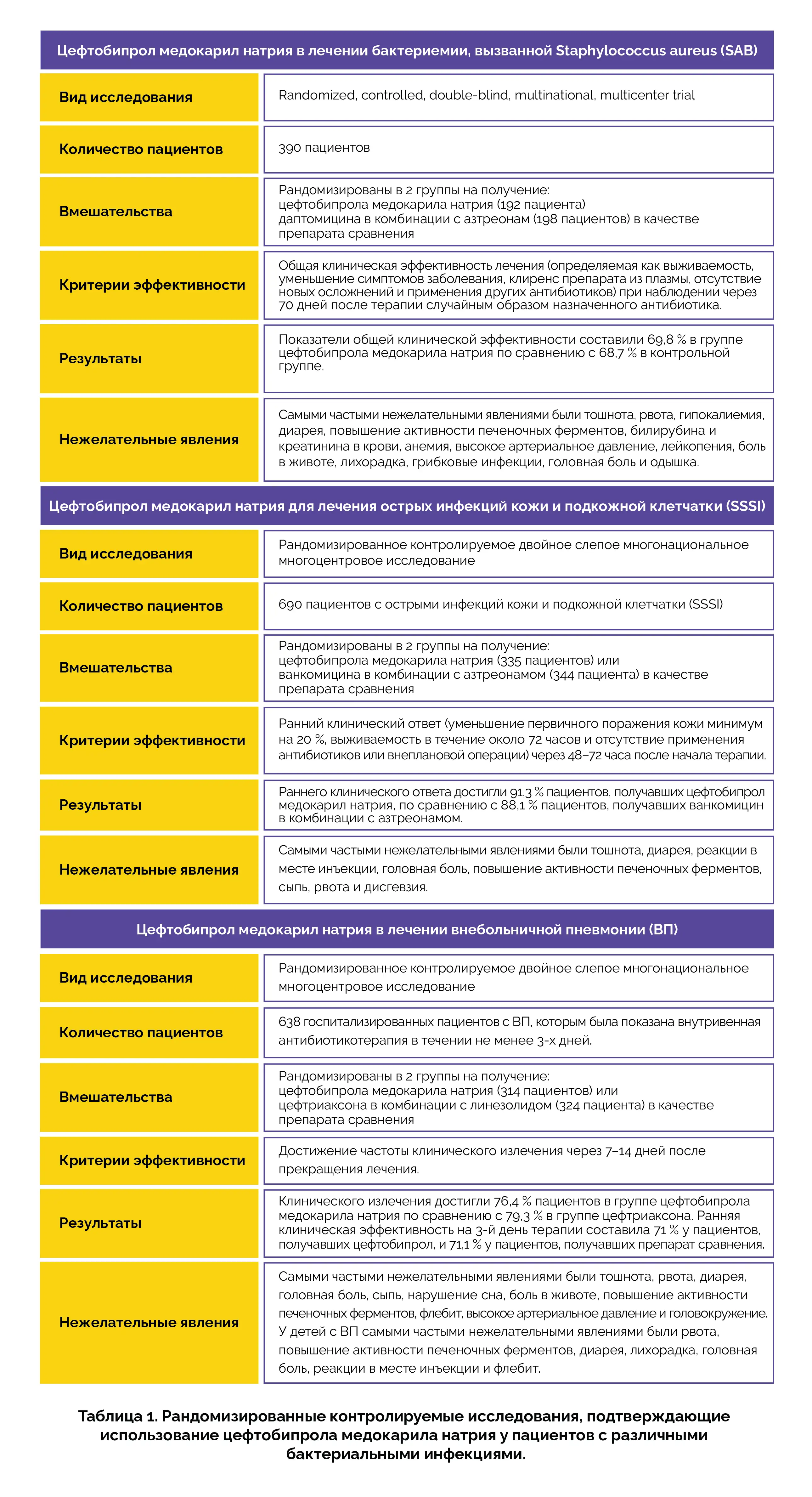 Одобрение новых показаний к применению основано на результатах исследований по оценке эффективности инъекций цефтобипрола медокарила натрия при различных бактериальных инфекциях:
