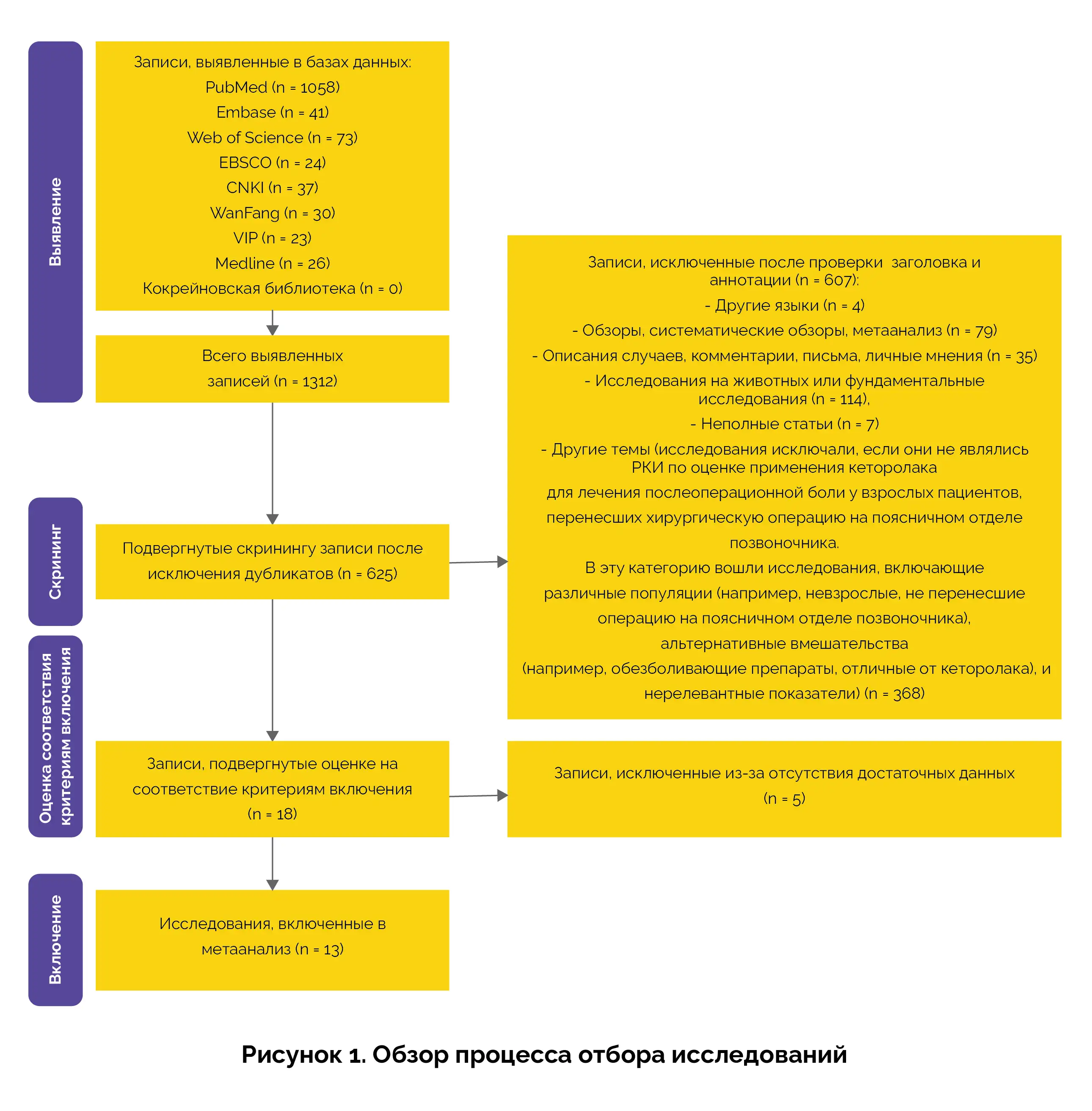Был выполнен систематический поиск в базах данных, включая Кокрейновскую библиотеку, China National Knowledge Infrastructure (CNKI), Elton B. Stephens Company (EBSCO), Embase, Medline, PubMed, VIP, WanFang и Web of Science, с момента их создания по май 2023 года. При поиске использовали ключевые слова и термины медицинских предметных рубрик (MeSH), такие как «анальгезия», «кеторолак», «хирургическая операция на поясничном отделе позвоночника», «хирургическая операция на позвоночнике» и «послеоперационная боль». Списки литературы соответствующих исследований и обзоров также просматривали вручную и повторяли процесс для выявления дополнительных соответствующих критериям исследований. В июле 2024 г. был выполнен окончательный поиск, результаты которого подтвердили, что в обзор были включены наиболее актуальные данные на момент оценки.