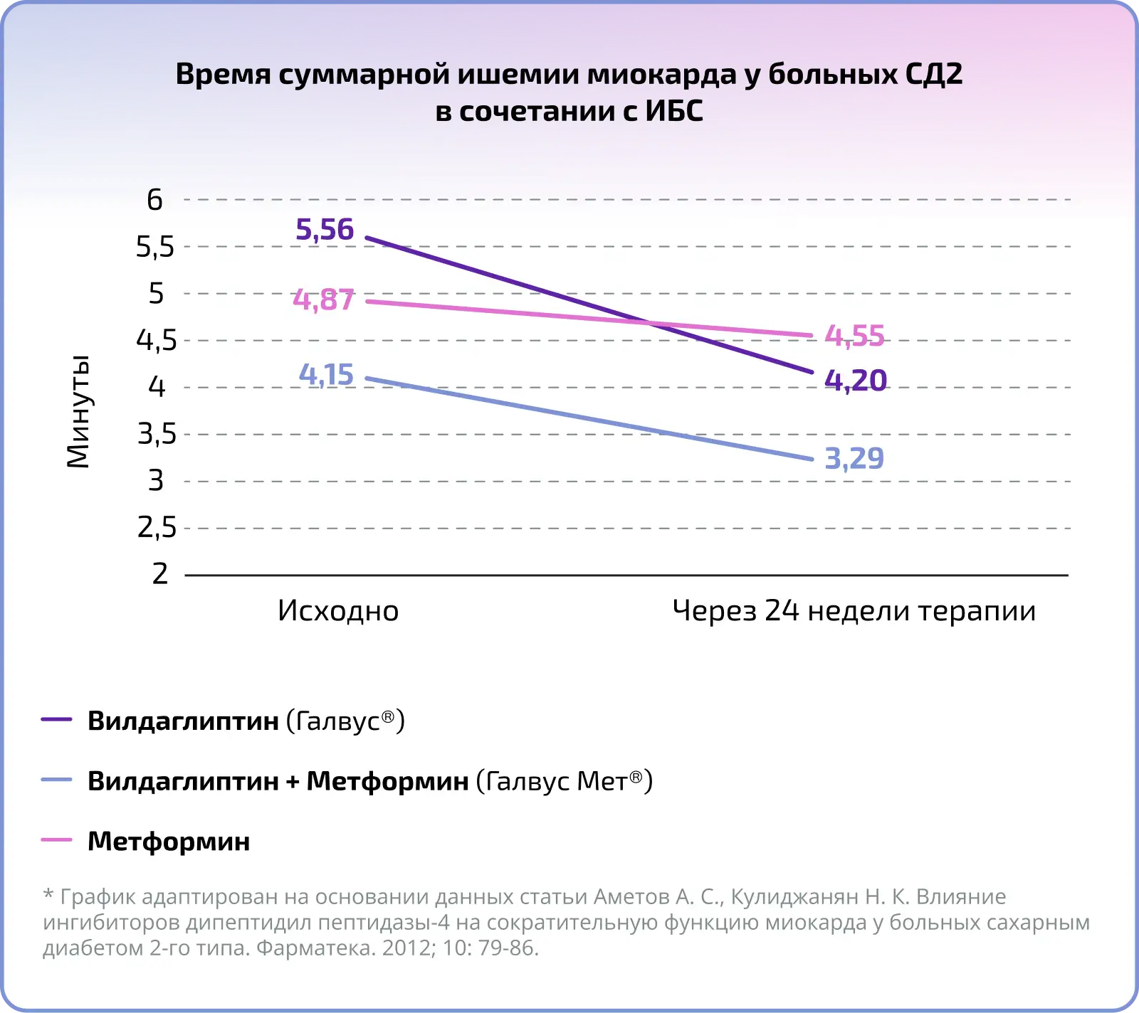по данным холтеровского мониторирования применение вилдаглиптина приводило к снижению времени суммарной ишемии миокарда (↓ количество эпизодов ишемии и их средней продолжительности):