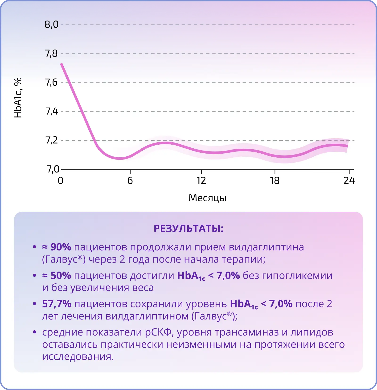 HbA1c: группа вилдаглиптин (Галвус®) — ↓ на 0,9%; группа комбинация вилдаглиптин + метформин (Гавлус® Мет) — ↓ на 0,8%; группа метфомин — ↓ на 0,7%;