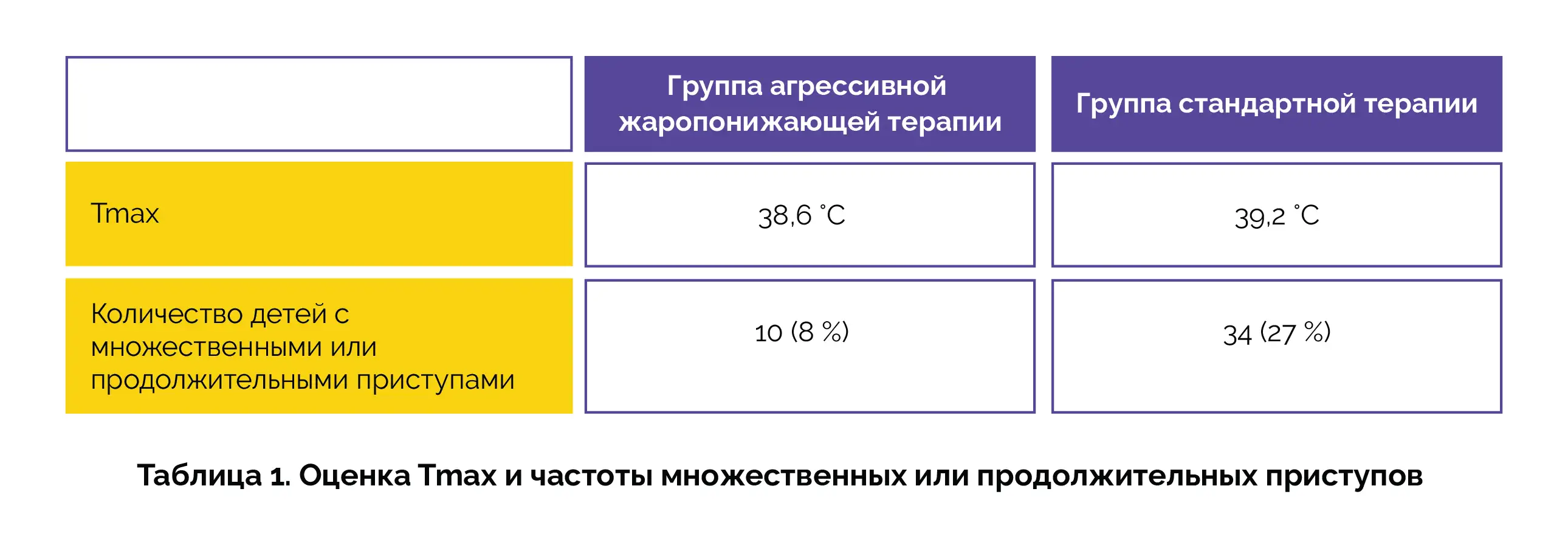 В группе агрессивной жаропонижающей терапии наблюдалась более низкая Tmax (разница −0,62 °C; 95 % доверительный интервал (ДИ) от −0,82 до −0,42; р < 0,001) и более низкие шансы возникновения множественных или продолжительных приступов по сравнению с группой стандартной терапии (отношение шансов (ОШ) 0,26; 95 % ДИ 0,12–0,56) (см. таблицу 1).