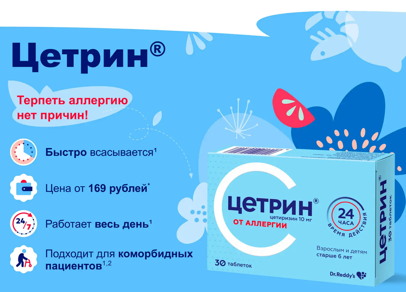 Цетрин® помогает бороться с симптомами аллергии в течение всего дня, благодаря 1 таблетке в день. Даже при длительном использовании вероятность развития толерантности к препарату остается низкой⁶ ⁷ ⁸.