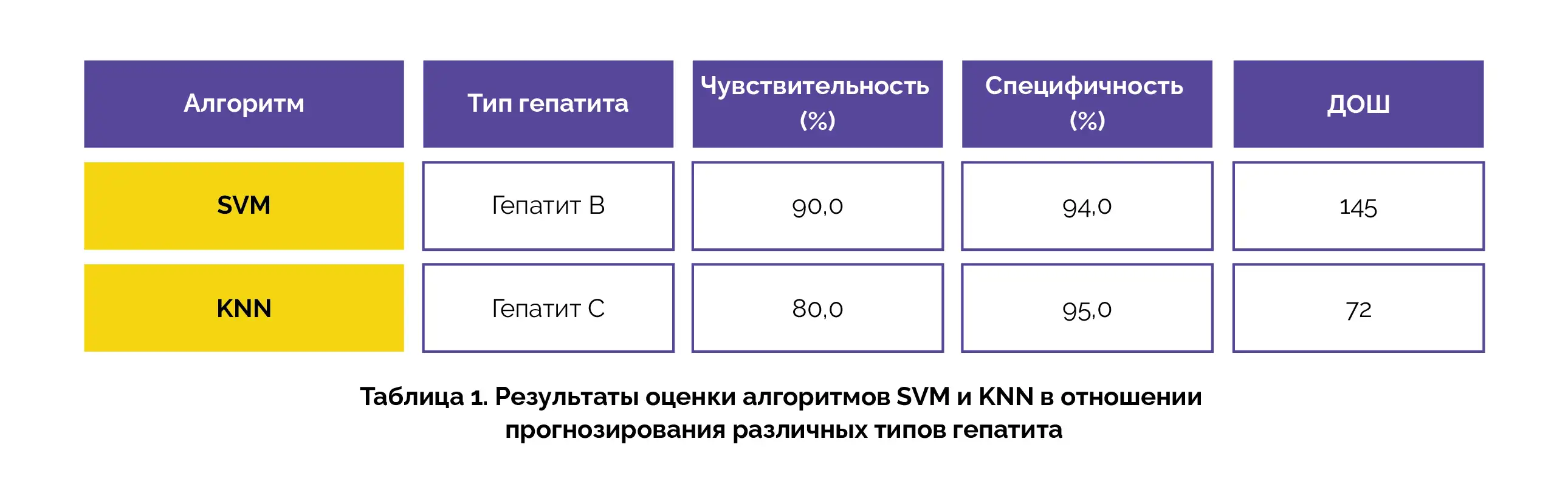 Алгоритмы машины опорных векторов являются более эффективными в отношении прогнозирования гепатита B, тогда как алгоритмы на основе метода k-ближайших соседей позволяют лучше прогнозировать гепатит C.