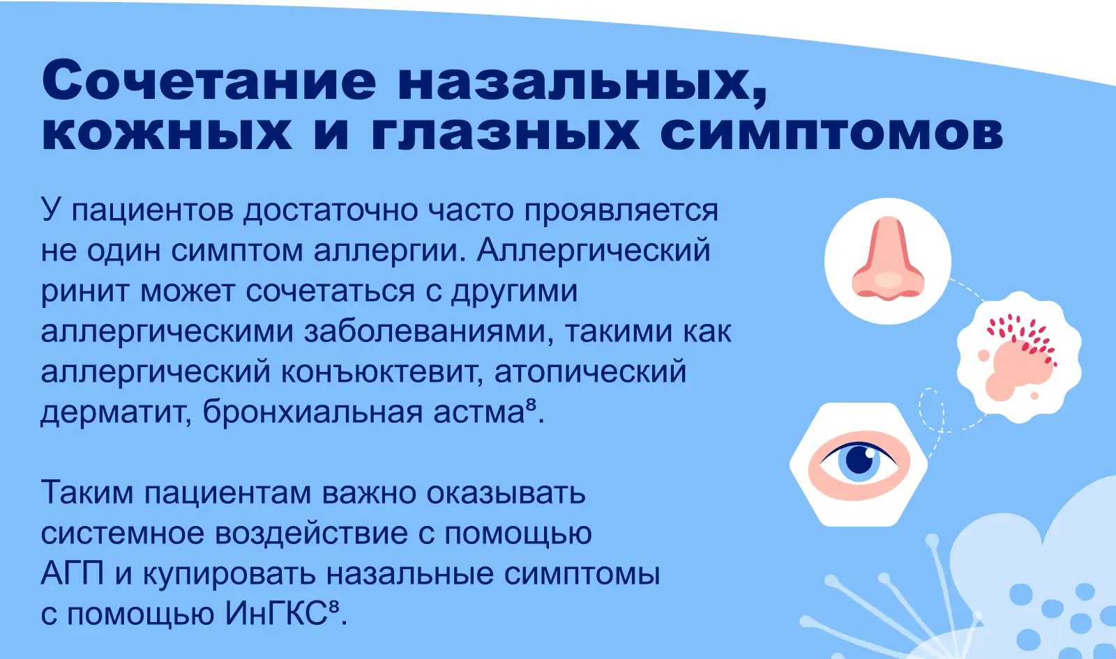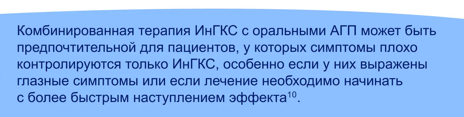 Для более эффективного контроля симптомов АР важно сочетать препараты разных фармакологических групп [9]. Например, у пациентов с сезонным АР возможны два подхода: либо монотерапия ИнГКС, либо их сочетание с оральными АГП [10].